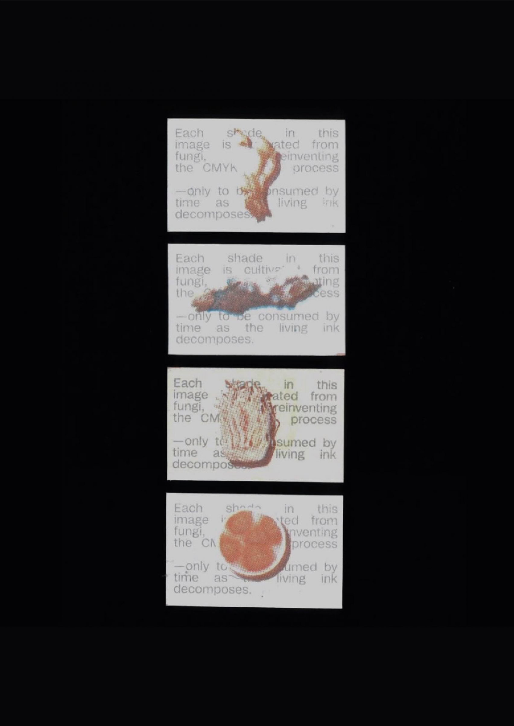Growink, şu anda serigrafi için optimize edilmiş durumda. Mürekkep canlı renklerini, farklı büyüme evrelerindeki mantarların biyolojik ritimlerinden ve çevresel koşullardan etkilenerek elde ettiği dört farklı pigmentten alıyor.