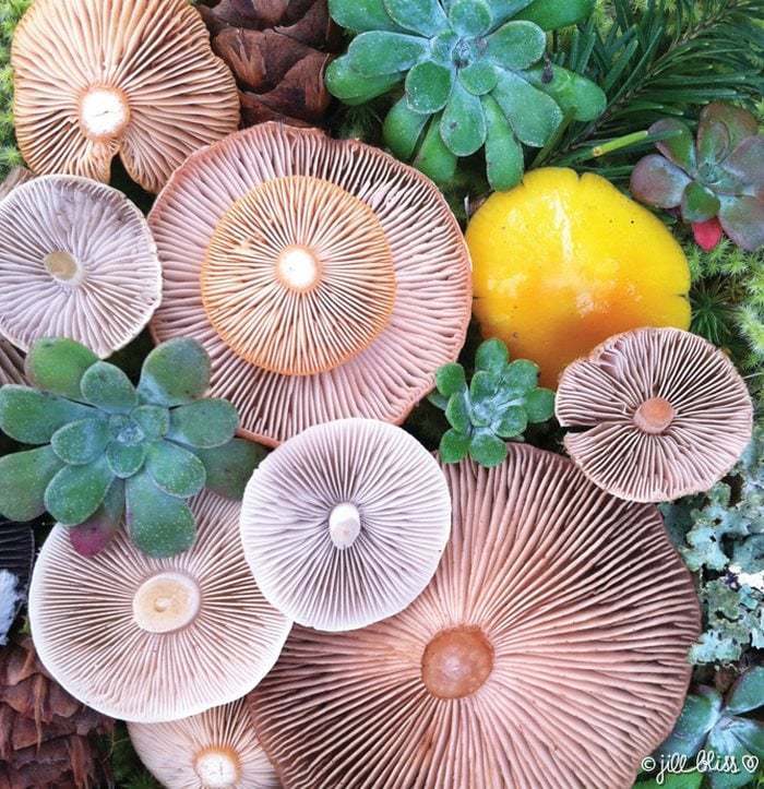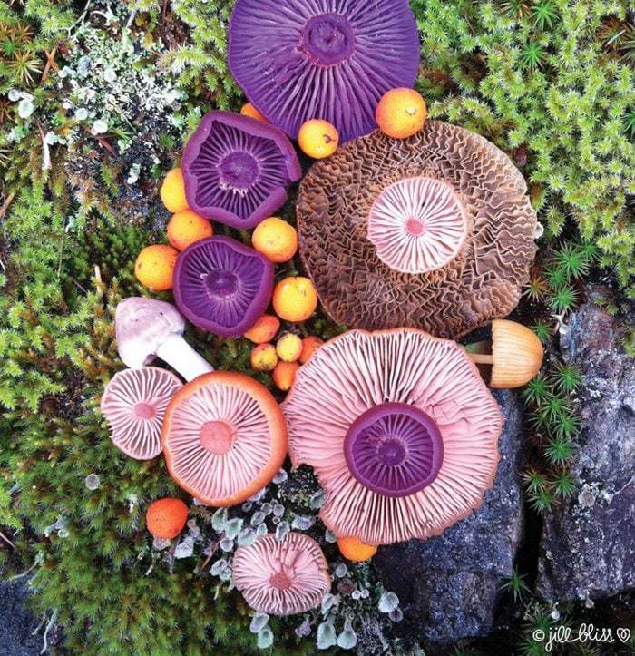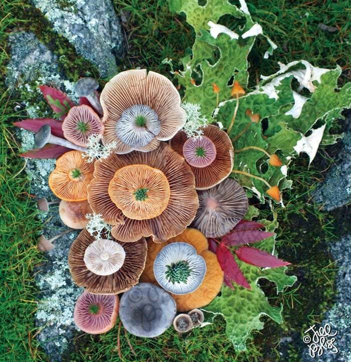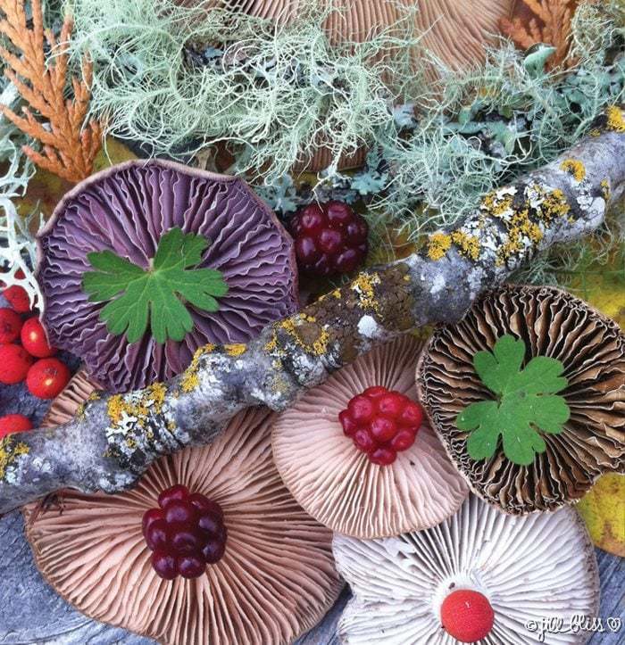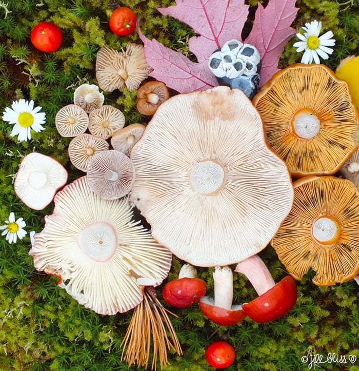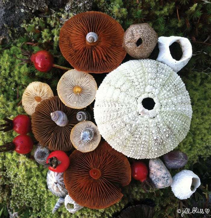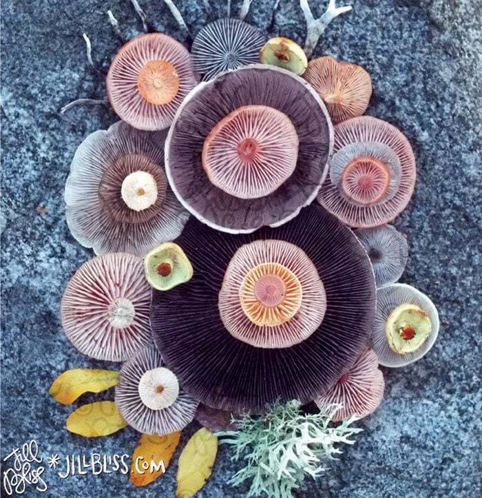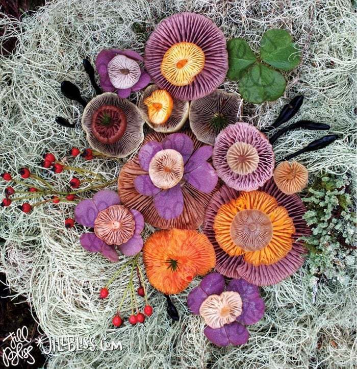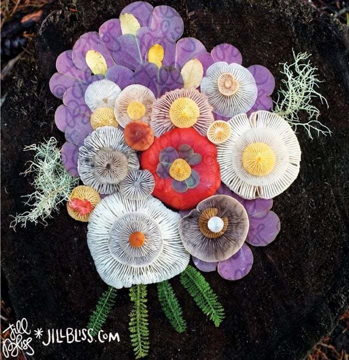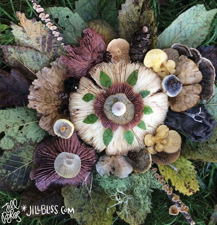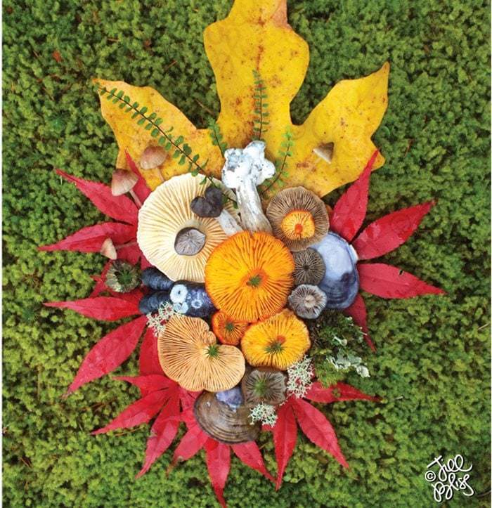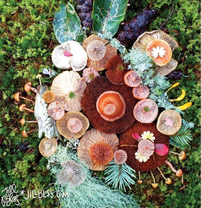 Pasifik Kuzeybatısı’nda -Pasifik Kıyı Bölgesi olarak da biliniyor- Salish Denizi’ndeki küçük bir adada yaşayan sanatçı Jill Bliss; doğabilimcilik, eğitimcilik, çiftçilik ve denizcilik gibi pek çok bilgi ve beceriye sahip. New York ve San Francisco’da yıllarca sürdürdüğü tasarımcılık kariyerinin ardından doğayla iç içe yaşamaktan başka hiçbir arzusu kalmayan Bliss, 2012’de evi de dahil sahip olduğu her şeyi satmış ve şu an yaşadığı adaya yerleşmiş. Adada yaşamaya başladıktan sonra orada rastladığı çeşitlilik bakımından zengin yabani mantarları çarpıcı düzenlemelere dönüştürmeye ve Nature Medleys adlı projesi için fotoğraflamaya başlamış. Mantar düzenlemelerini; yaprak, meyve, çiçek ve mercan kabuklarıyla da süslendiği görülebiliyor.