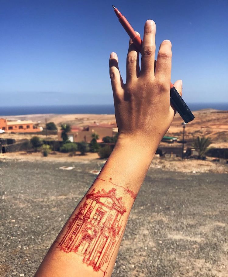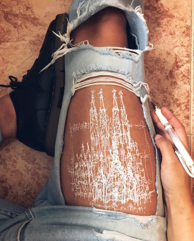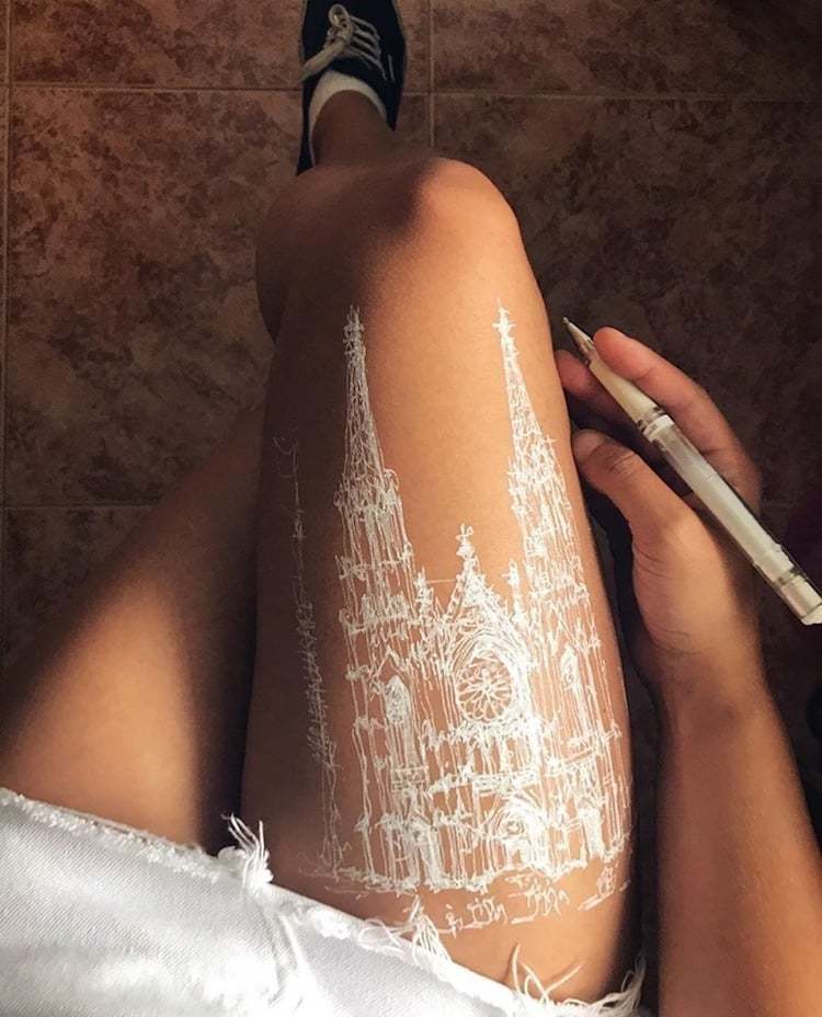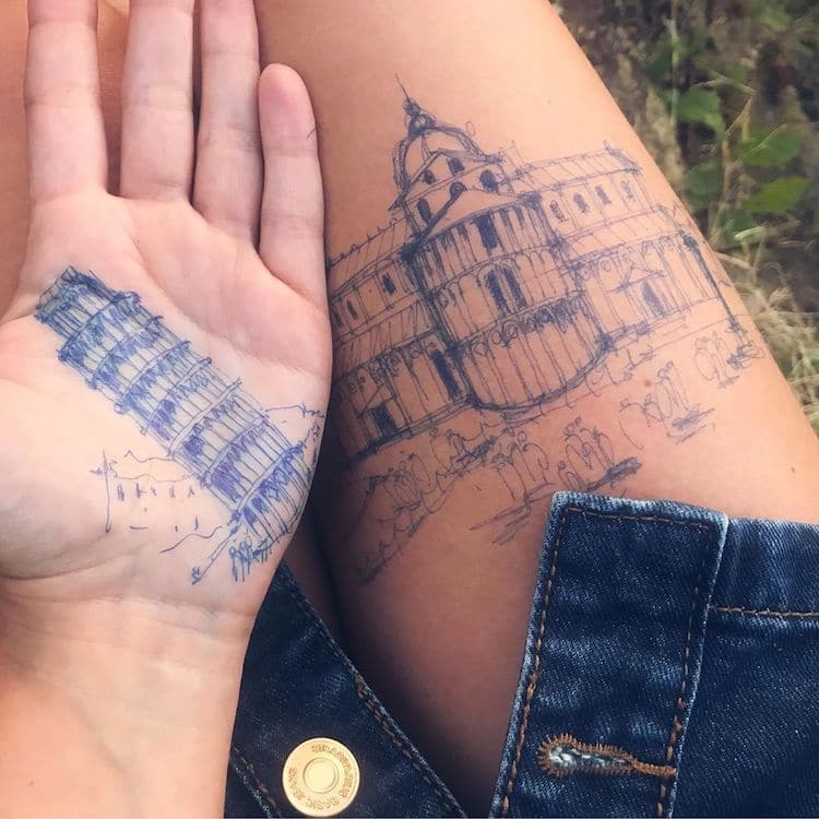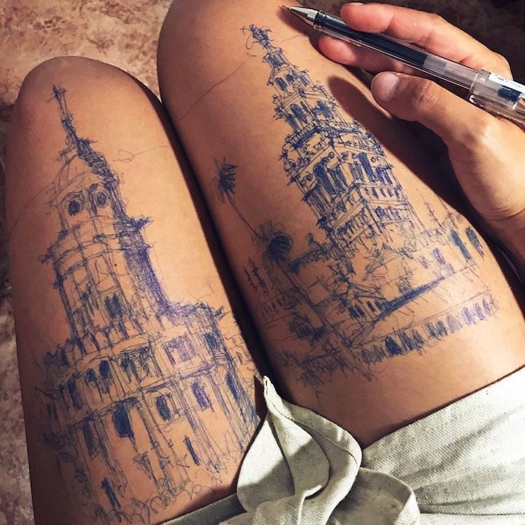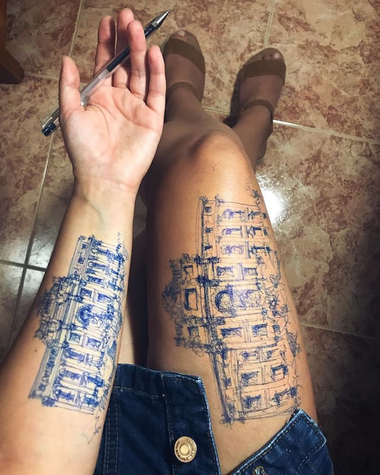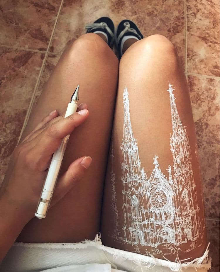 Arada sırada kağıt, peçete, parçalanmış mukavvalar ya da siyah resim kağıdı üzerine yaptığı çizimleri de paylaşıyor sanatçı. Ancak kendi bedenine yaptığı çizimler şık birer mimari dövmesi gibi durduğu için daha çok dikkat çekiyor.