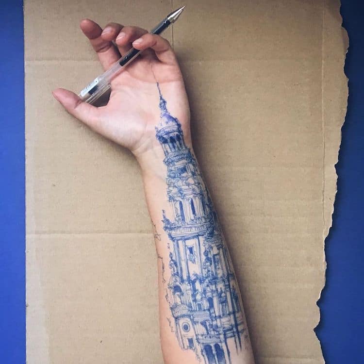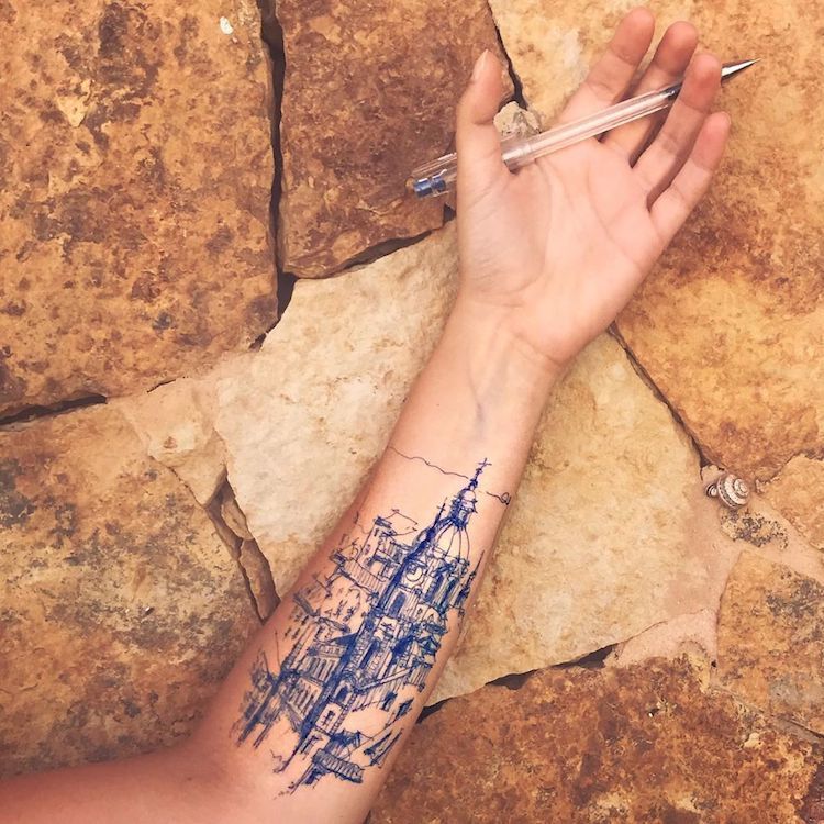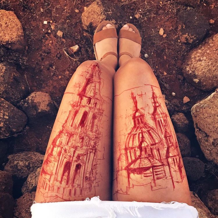 Sanatçılar ve tasarımcılar mimariye duydukları tutkuyu farklı şekillerde ve farklı tekniklerle dışa vuruyorlar. Drop-a-Pin’in yaka iğneleri, Federico Babina’nın illüstrasyonları, Parth Kothekar’ın kağıt kesme sanatıyla çıkardığı işler, Charles Henry ve Elin Petronella çiftinin nakışları ya da Matthias Jung’ın gerçeküstü kolajları bunun en güzel örnekleriydi. Mariela Luis ise mimari tutkusunu kendi bedenine çizim yaparak dışarı vuruyor.