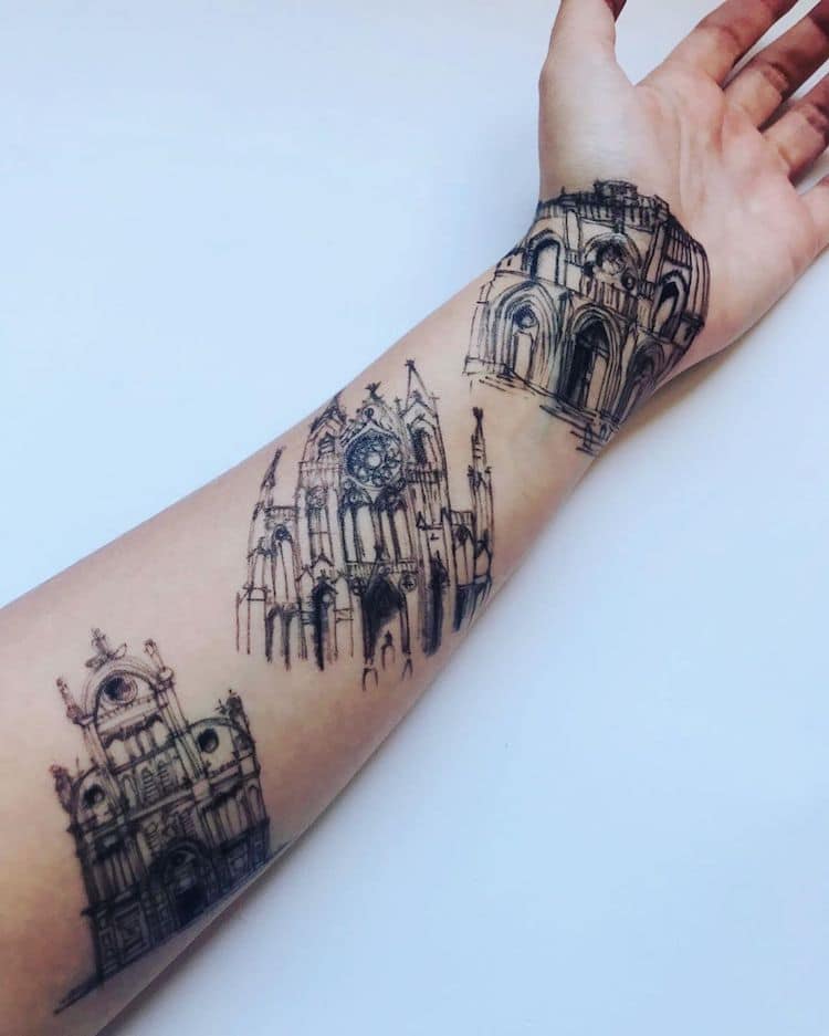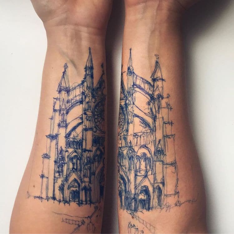 Londra’daki Westminster Abbey’den New York’taki St. Patrick Katedrali’ne kadar pek çok önemli ve karmaşık detaylara sahip yapıyı kağıttan daha zor bir yüzey olan kendi cildine çiziyor. Üstelik bunlar silinmeye mahkum geçici sanat eserleri. Bu çizimleri ölümsüzleştiren tek şey fotoğraflar.