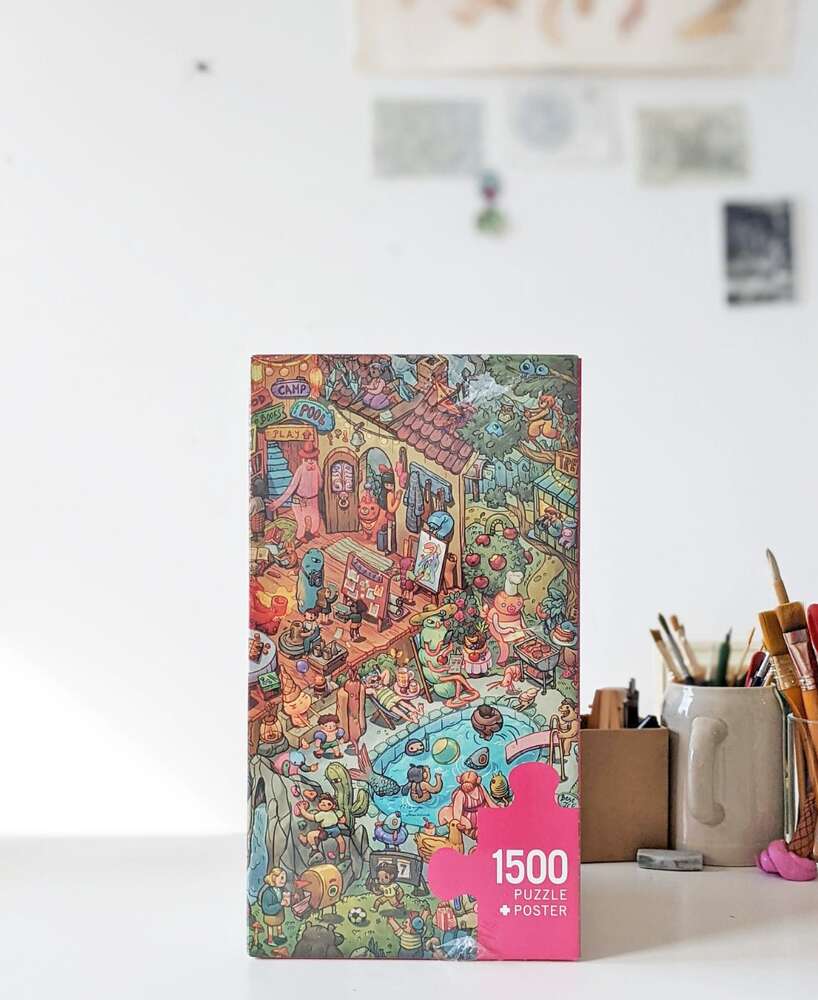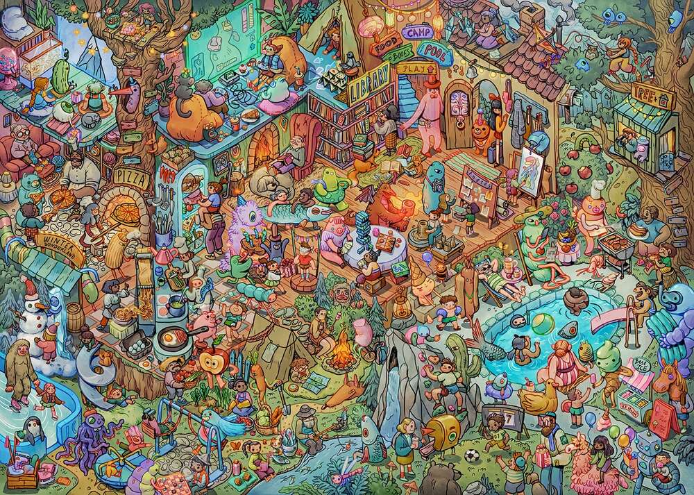 Yapbozdaki illüstrasyon ailelerin ve hayali arkadaşların bir araya geldiği tuhaf bir tatil beldesini tasvir ediyor. Yetişkinler, çocuklar ve çok sayıda fantastik karakter; havuz kenarında dinlenmek, video oyunları oynamak, balık tutmak ve buz pateni yapmak için tatil mekanına akın etmiş.