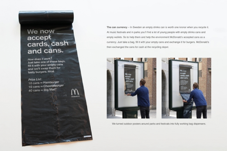 Bir başka örnekse McDonald’s tarafından gerçekleştirilen “Can Currency” projesi. DDBStockholm tarafından yaratılan kampanyada, getirdiğiniz belirli sayıdaki metal içecek kutusu için ücretsiz menü alabiliyorsunuz.