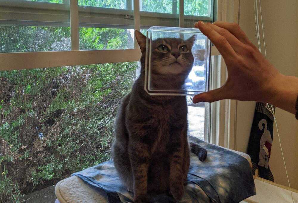Ferraro, akrilik yüzeyin eğriliğini belli noktalarda iki milimetreden fazla olmayacak şekilde hafifçe değiştirmiş. Böylece içi boş görünen plakayı, ışıkla etkileşime girerek holografik bir kedi imgesi üreten sihirli bir düzeneğe dönüştürmüş.