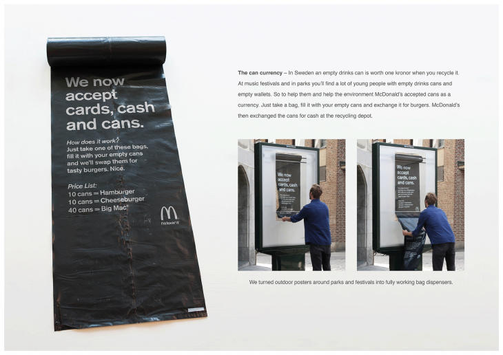 Markalar geri dönüşüme teşvik projelerinin içine kişileri ödüllendirme sistemini entegre ettiğinde oldukça başarılı işler çıkarıyorlar. DDB Stockholm, McDonald’s için çevreci bir uygulama başlattı. Teneke kutu karşılığında Mc Donald’s’tan ücretsiz olarak yiyecek kazanmak mümkün. Örneğin kişiler 10 teneke kutuya hamburger, 40 tanesine ise Big Mac kazanabiliyorlar. Bunun için ise çantaya dönüşebilen ilanlar kullanılıyor. Kişiler projenin özetlendiği posterleri çıkarıp onları çantaya dönüştürüp içine bu tip çöplerini koyarak yiyeceklerini alabiliyorlar.