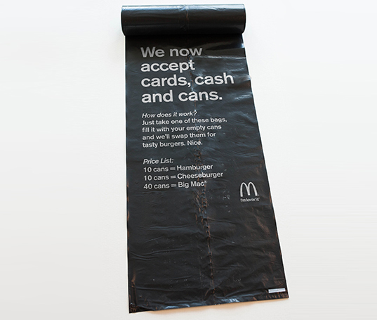 McDonald’s, DDB Stocholm ile bir araya gelerek, insanların hamburger için ödediği para birimini geri dönüştürülebilir çöplerle dolu poşetlere çeviren bir uygulama getirdi. Proje için açıkhava panolarına insanların çöplerini atacağı poşetler yerleştirildi.
