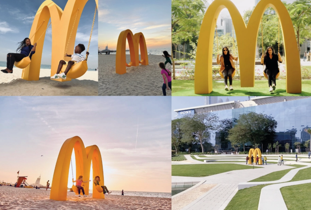 Altın Kemerler şeklindeki salıncak setleri Dubai’de Media City, Internet City, Knowledge Park ve Kite Beach gibi noktalara yerleştirilmiş. Bu etkileşimli kampanya, fiziksel bir reklamın toplum üzerinde nasıl hala güçlü bir etkiye sahip olduğunu ortaya koyuyor bir bakıma. Altın Kemerler, kenet sakinlerine “kaç yaşında olursak olalım, eğlenmek için asla çok yaşlı değiliz” mesajını fısıldıyor.