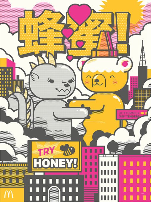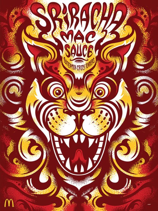 Posterlerde her sos için farklı sanatçılarla çalışılarak, ayrı bir karakter ve görsel dünya yaratılmış. Delicious Design League ortağı Billy Baumann’ın da belirttiği gibi her bir sosun özellikleri ve duyguları anki bir kişiymiş gibi tasarıma taşınmış. Bu nedenle “Honey” posteri daha tatlı, sevimli, ayıcıklı bir tasarım diline sahipken acı sos “Sriracha Mac” daha uzak doğu esintili, renkleriyle baharatı hissettiren bir tarza sahip.