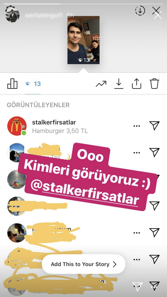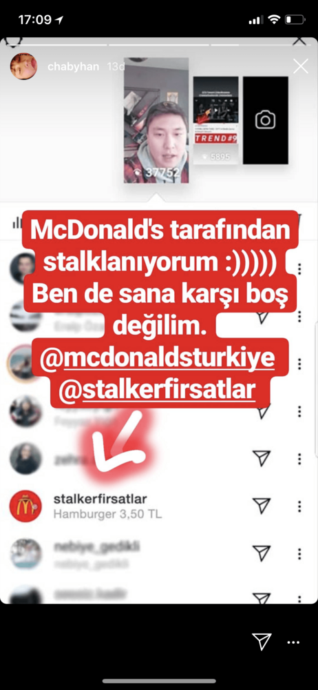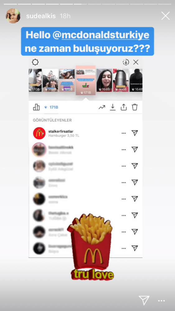 McDonald’s Türkiye, Voden Leo Burnett ile gerçekleştirdiği çalışma ile reklam bütçesi olmadan Instagram’daki Hikayemi Görüntüleyenler sekmesini kullanıp yeni bir reklam mecrası yarattı. “Hikayelerime kim bakmış?” rutini esnasında Stalker Fırsatlar hesabını gören kullanıcılar McDonald’s’ın güncel kampanyalarıyla karşılaşmış.