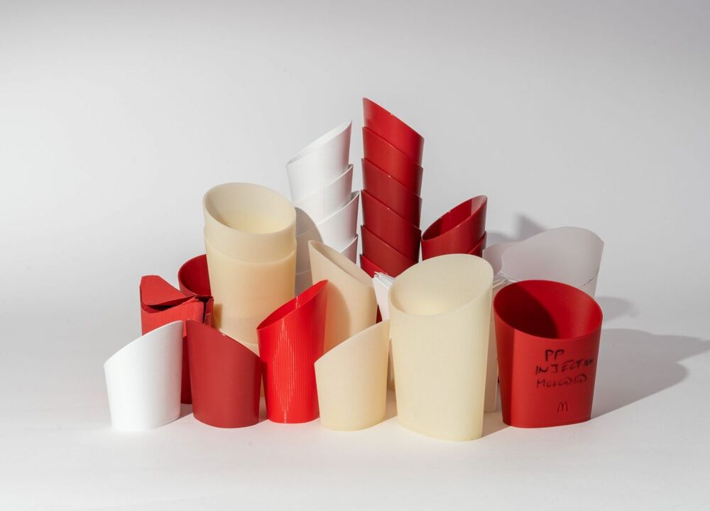 2020 yılında meyve ve sebzelerin plastik ambalajlarda satışını yasaklayan Fransa’nın bu kararının genişleyeceği beklentileriyle yeniden kullanılabilir ambalaj tasarımı çalışmalarına başlayan McDonald’s Fransa, Elium Studio ile gerçekleştirdiği iki yıllık ortak çalışmanın sonucunda yeniden kullanılabilir yemek takımlarını yarattı. Stüdyo, tasarımların sertliğini sağlamak için cam ile seramiğe benzeyen, aynı zamanda yiyeceklerin tadıyla kokusunu bozmadan koruyabilen plastik bir reçine olan Tritan’ı hammadde olarak kullandı.