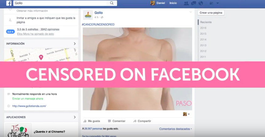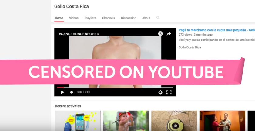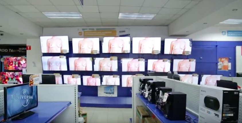 Costa Rica’nın en büyük perakende zinciri Gollo, meme kanserini erken teşhis etmek için kadınların rutin olarak yapması gereken muayeneyi, ülke çapındaki mağazalarında reyonlarda yer alan televizyonlara yansıtarak meme ucuna uygulanan sansürü atlatmayı başardı.