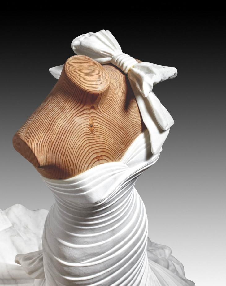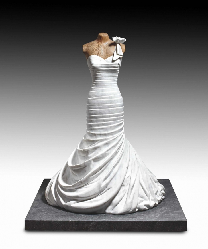 Heykeltıraş Alasdair Thomson, kocaman mermer kalıplarını elde yontarak ve işleyerek mermerin sağlamlığı ve ağırlığı ile model aldığı elbiselerin zarafetini çarpıştırarak müthiş bir diyalektik temelli mermer elbise koleksiyonu ortaya çıkarmış.