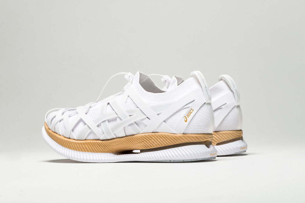 Tasarım, çapraz beyaz şeritlerin üst üste bindiği bindiği, çorap formunda bir ayakkabı. Esnek malzeme, bambu örgü tekniğine (yatara ami) benzer sağlam bir yapı oluşturmak için birbirine kenetlenmiş görünüyor. Geri dönüştürülmüş polyesterden yapılmış şeritler, ayağı sabitlemek için stratejik olarak yerleştirilmiş.