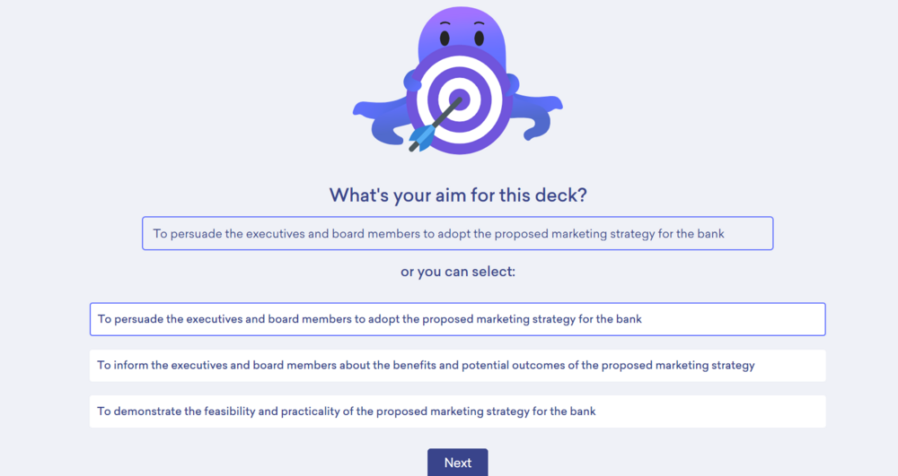 Decktopus’u kullanarak tasarım bilgisi gerektirmeden minimum süre içerisinde sunum hazırlamak için öncelikle platform üzerinde bir hesap oluşturmalı; ardından metin istemiyle yapay zekâya sunumun temasını tanımlamalısınız. Örneğin “Bir banka için pazarlama stratejisi sunumu” gibi. Metin isteminin ardından yapay zekâ size öncelikle bu sunumun hedef kitlesinin kim ya da kimler olduğunu, amacını, süresini ve sunum kreatifinde tercih ettiğiniz tarzı seçeneklerle birlikte soruyor. Yapay zekânın sorularına seçenekler üzerinden yanıt verdiğinizde kısa bir süre sonra sunum taslağı düzenleme ara yüzüyle birlikte ekranınızda beliriyor. Bu aşamadan sonra sunumunuzu dilediğiniz şekilde detaylandırabilir veya kişiselleştirebilirsiniz.