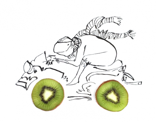 Ödüllü illustratör Juana Medina genellikle yaptığı illustasyonlarla bir seri yaratıp hikaye anlatan bir sanatçı, bu işinde de işe buna bir eğlence katmış. Washington DC’de yaşayan Medina, illustrasyonlarını çeşitli meyvelerle süslüyor, projedeki karakterlerden birinin saçları, birinin vücudu meyvedenken bir diğerinde motorsiketin tekerlekleri kivi dilimlerinden çizilmiş. Çok neşeli! 🙂