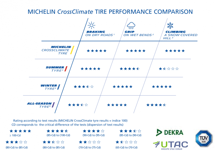 CrossClimate bu alanda kış lastiğine ihtiyaç duymadığını düşünen tüketiciye yönelik olarak konumlandırıyor kendini. Lastik sessizliği, kuru zeminde yol tutuşuyla standart bir yaz lastiğinin performansından aşağı kalmıyor, bunun yanında kış lastiklerine verilen sertifikasyona da sahip. Yani soğuk havada yol tutuşunu kaybetmeyen özel bir hamuru ve kar tahliyesine uygun desenleri var.