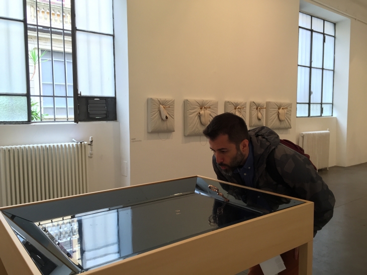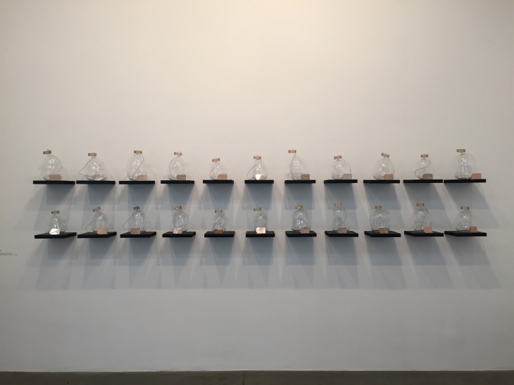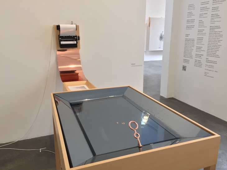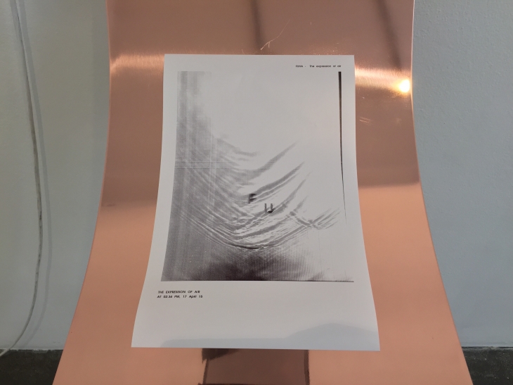 Serginin en ilginç yerleştirmelerinden birisi, imprint‘ti. Suya üflediğimiz bu yerleştirmede su üstünde nefesimizin bıraktığı izler, bir tarayıcı ile kaydediliyor ve görüntünün çıktısı kısa bir süre içinde karşıda yer alan termal yazıcıdan çıkartılıyor.