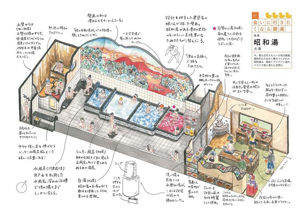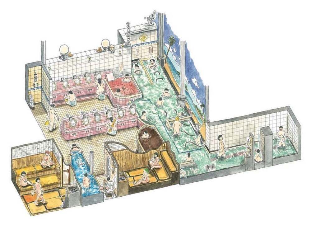 Honami Enya’nın illüstrasyonlarını uzun uzun incelediğinizde; mimari kesitler halinde gösterilen ilginç yapıları, iç mekan süslemelerini, insanların yorgun bedenlerini su ve buharla kaplı rahatlatıcı atmosfere bırakışını, yüz ifadelerindeki mizahı ve daha sayısız detayı keşfedebilirsiniz.