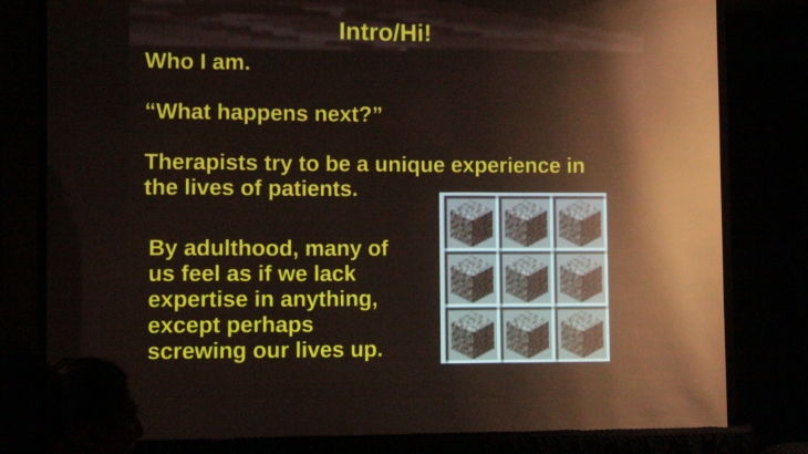 Psikoterapist Michael Langlois, bir saatlik sunumu boyunca oyunların, sandbox denilen açık dünya içerisinde oyuncuların kendi amaçlarını yarattığı oyun türünün ve Minecraft‘ın insan psikolojisi üzerinde yarattığı etkiyi sosyal ve bireysel açıdan değerlendirdi. Sunumun samimiyeti ve kurulan iletişime sadık kalarak, Michael gibi Minecraft’ın fiziksel dünya ile benzerliklerini anlatırken adım adım ilerleyemeyi tercih ediyorum.