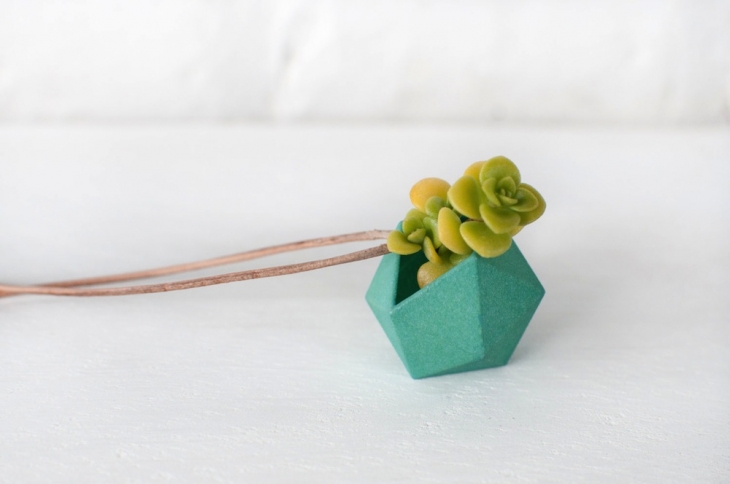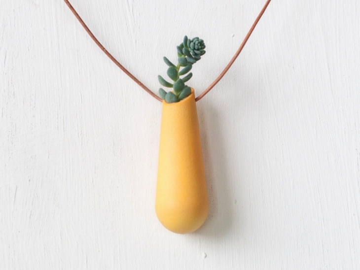 Kolye, broş veya bisiklet askısıyla kullanılabilen bu tasarımlar, düz tabana sahip olduğu için zeminler üzerinde durabiliyor da. Elmas, zümrüt gibi materyalleri aksesuar haline getirmek yerine çok daha sade ve sık tasarımlar sunuyor Wearable Planter.