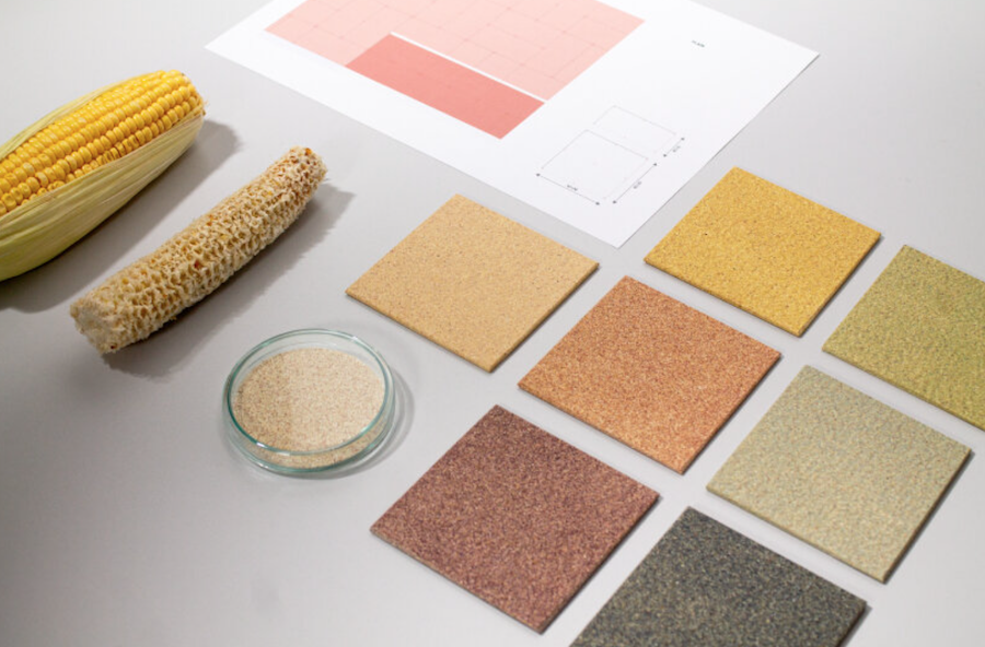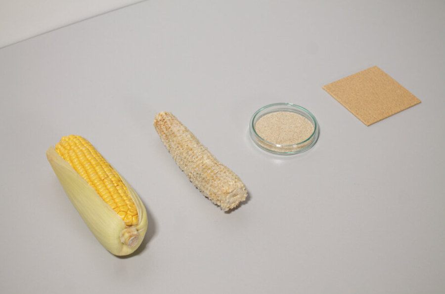 CornWall’un kaynağı çoğunlukla Batı Avrupa mısırından toplanan mısır koçanlarının orta kısmı. Mısırın büyürken çevreden karbondioksiti emdiği gerçeğinden yola çıkan StoneCycling ve Circular Matters ikilisi için, koçanlar seramik duvarlara veya HPL gibi diğer daha az çevre dostu kompozit malzemelere kıyasla daha yeşil ve bilinçli bir seçim olmuş.