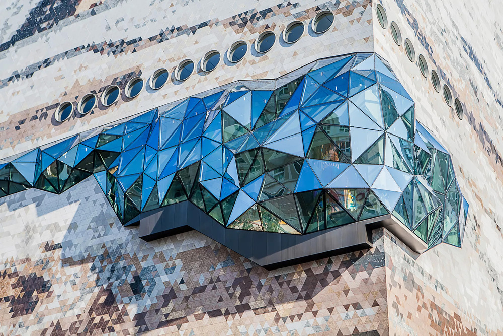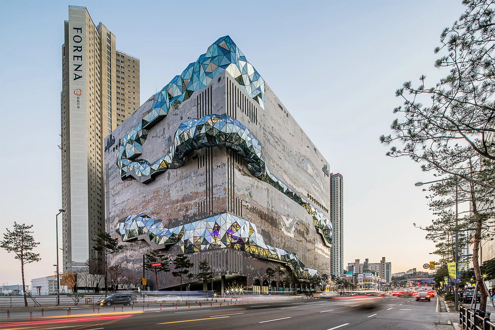 Hollanda merkezli mimarlık firması OMA’nın (Office for Metropolitan Architecture) Asya ekibinin lideri Chris van Duijn’in tasarladığı yapı, Seul’ün yaklaşık 25 kilometre güneyinde bulunan Gwanggyo şehrinde, gri ofis binaları ve diğer beton yapılar arasında çizgi üstü bir mimari yapı olarak göze çarpıyor. Yapı, Galleria alışveriş merkezi – evet ne yazık ki bir bir alışveriş merkezi – olarak halka açılmış. Bina, üçgen taşlarla örülü mozaik bir cepheye sahip. Ziyaretçiler, geometrik opal pencerelerden oluşan koridorlardan dışarıda neler olup bittiğini görebiliyorlar.