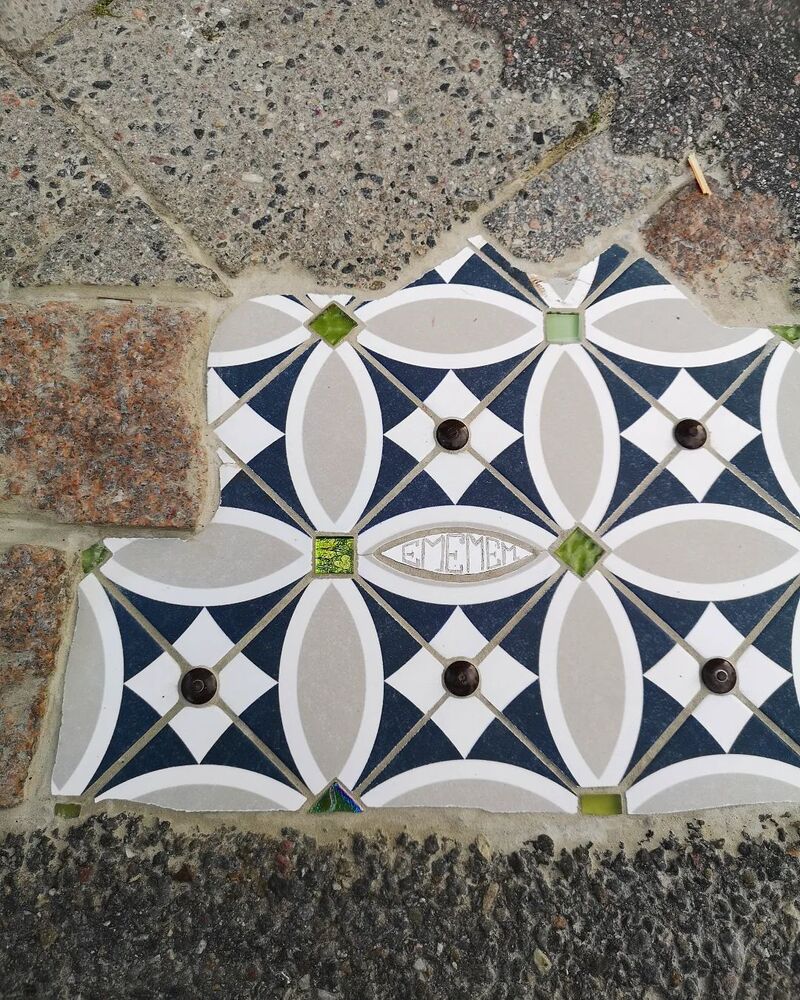 Kaldırımdaki, direklerin etrafındaki, duvardaki veya basamaklardaki hiçbir çatlak Ememem’in gözünden kaçmıyor.. “Kaldırım cerrahı” olarak da tanınan Lyon merkezli sanatçı mozaik malzemelerinin yanı sıra evlerde kullanılan desenli fayansları da malzemeleri arasına eklemiş. Sokaklara yaklaşımı, Japon kültüründe kırık çömleklerin altınla onarıldığı kintsugi sanatını anımsatıyor. Sanatçı, sokak zeminini daha güvenli hale getirirken, çürüyen kentsel yürüyüş yollarına da yeni bir hayat kazandırıyor.