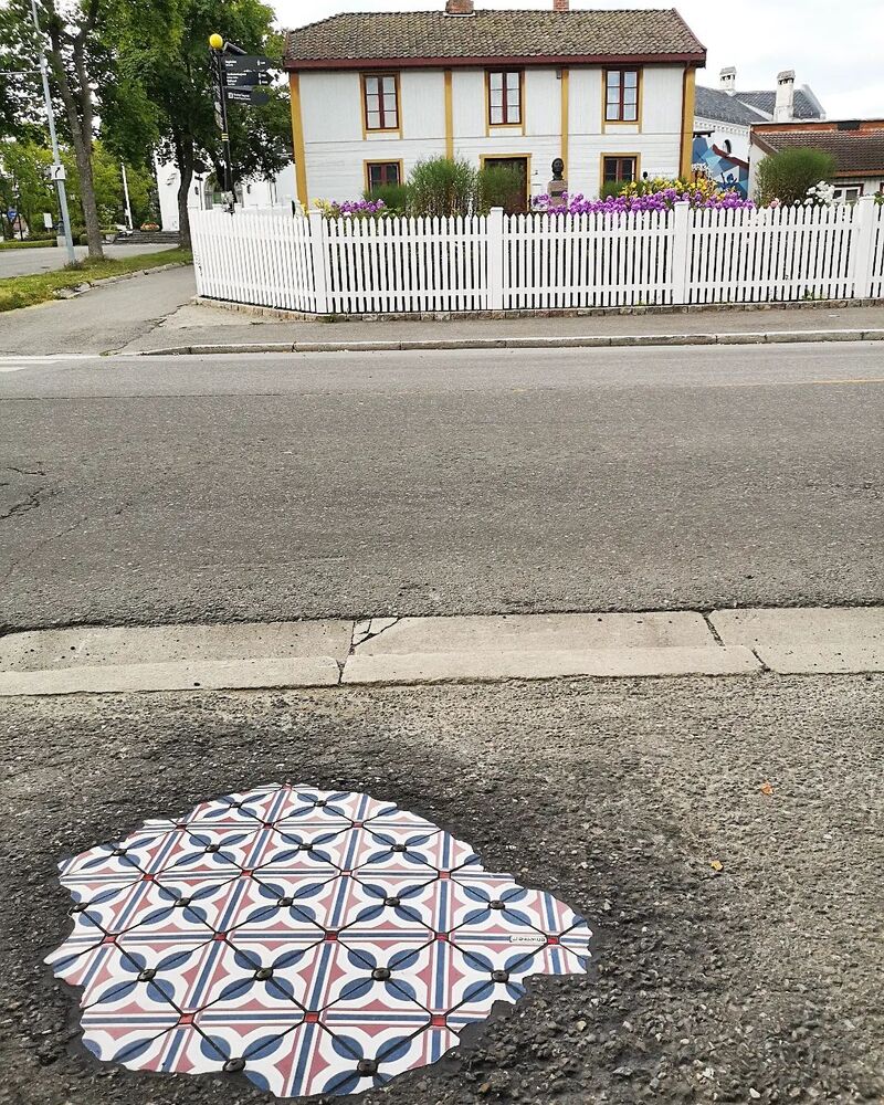 Hasarlı kaldırımları, binaları ve yolları mozaiklerle tamamlayan Fransız sanatçı Ememem yıllar içinde dünyanın en tanınan ve sevilen sokak sanatçılarından biri haline geldi. Biz de birkaç yıl önce işlerine yer vermiştik. O günlerden bu yana sanatçı, kendi stilini geliştirmek ve yenilikler yapmak üzere üretmeye son sürat devam etmiş. Son yıllarda yaptığı işlerde ise desenli karoları da işin içine katarak bir farklılık yaratmış.