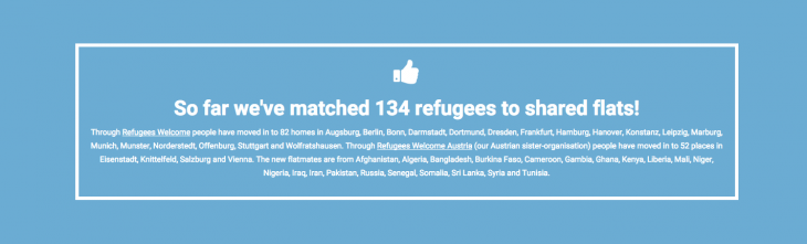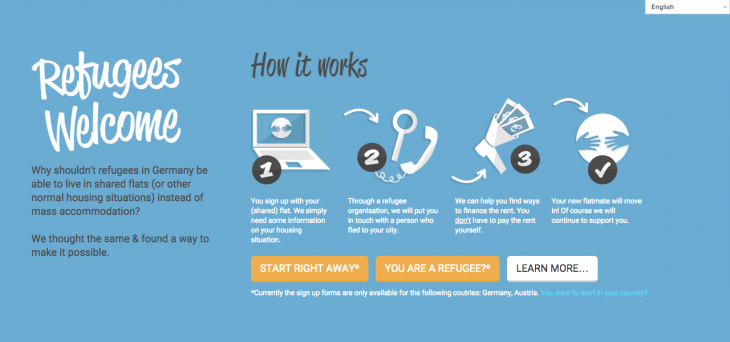 Refugees Welcome; Afganistan, Burkina Faso, Gana, Kamerun, Mali, Nijerya, Pakistan, Somali, Suriye, Tunus gibi ülkelerden gelen mültecilerle Almanya ve Avusturya’da kentte yaşayan “sizin bizim gibi” insanları buluşturuyor. Girişim, bugüne kadar 134 mülteci için barıncak alan yarattı.