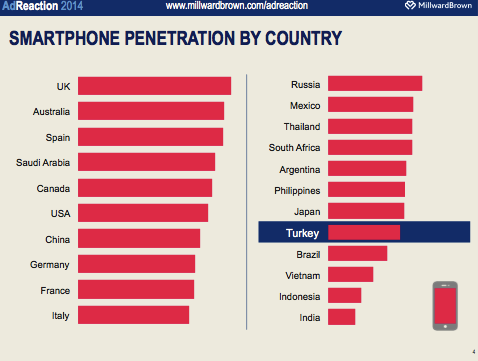 “Mobil, günümüz pazarlama dünyasındaki en zor işlerden biri” diyerek söze başlayan Southgate, ilk olarak ülkelerin akıllı telefon penetrasyonlarını paylaştı.