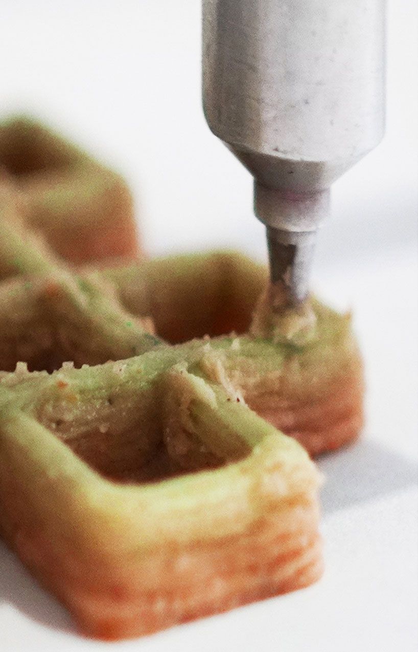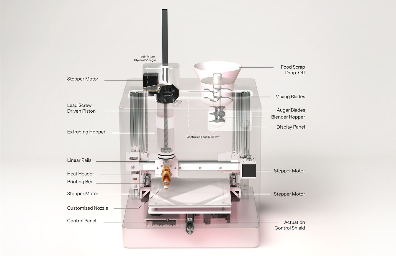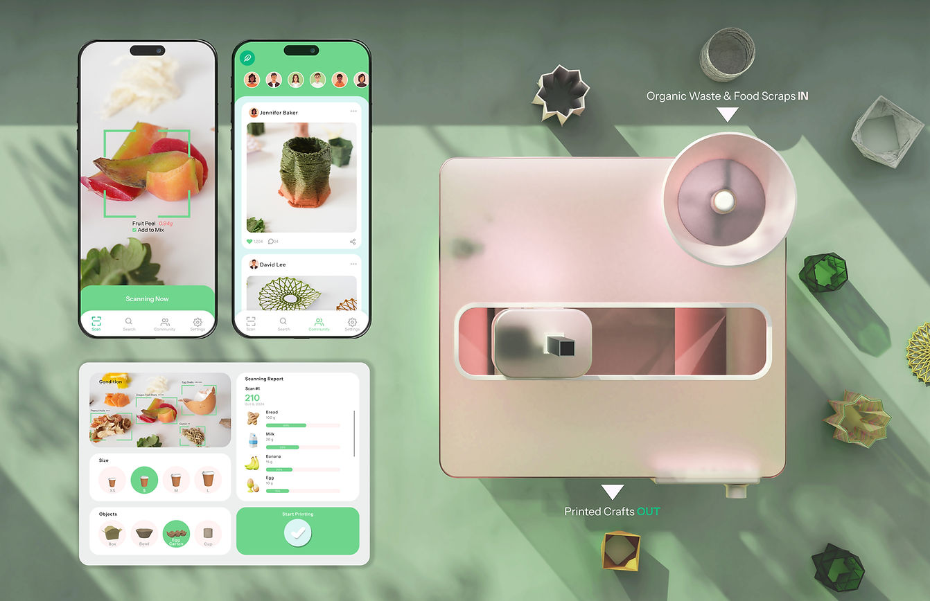 Cihaza entegre edilen özel üç eksenli ekstrüzyon sistemi ve otomatik malzeme işleme modülü sayesinde mutfak atıkları, yerleşik ısıtma ve karıştırma mekanizmasıyla baskıya uygun biyoplastik bir macuna dönüştürülüyor. Bu malzeme, bardak altlığı, kap-kacak veya dekoratif eşyalar gibi önceden seçilen formlarda yazdırılabiliyor.