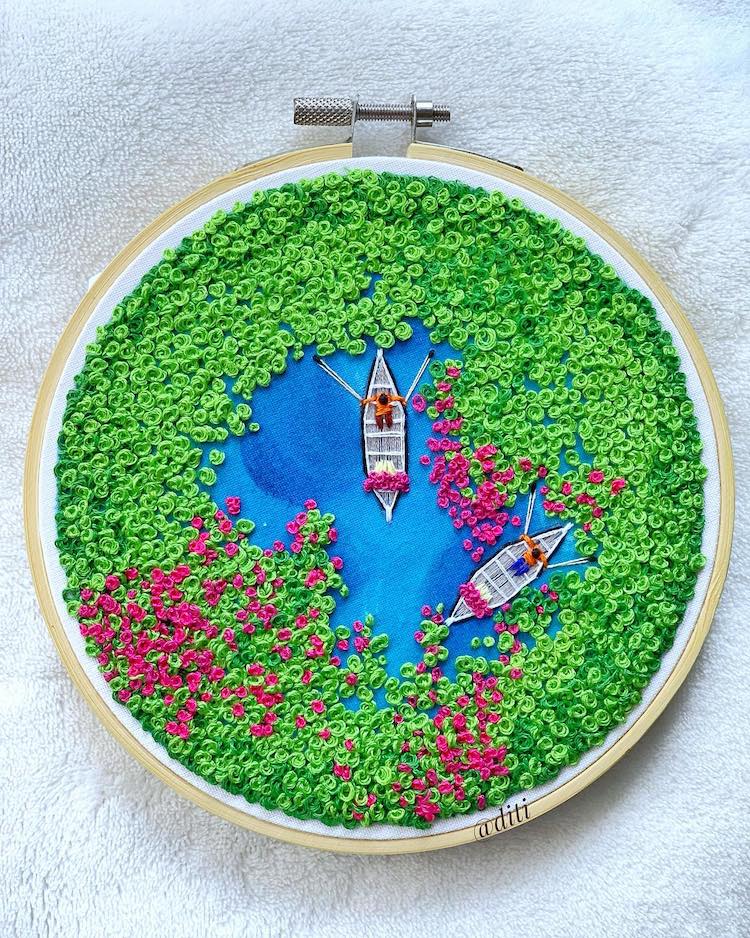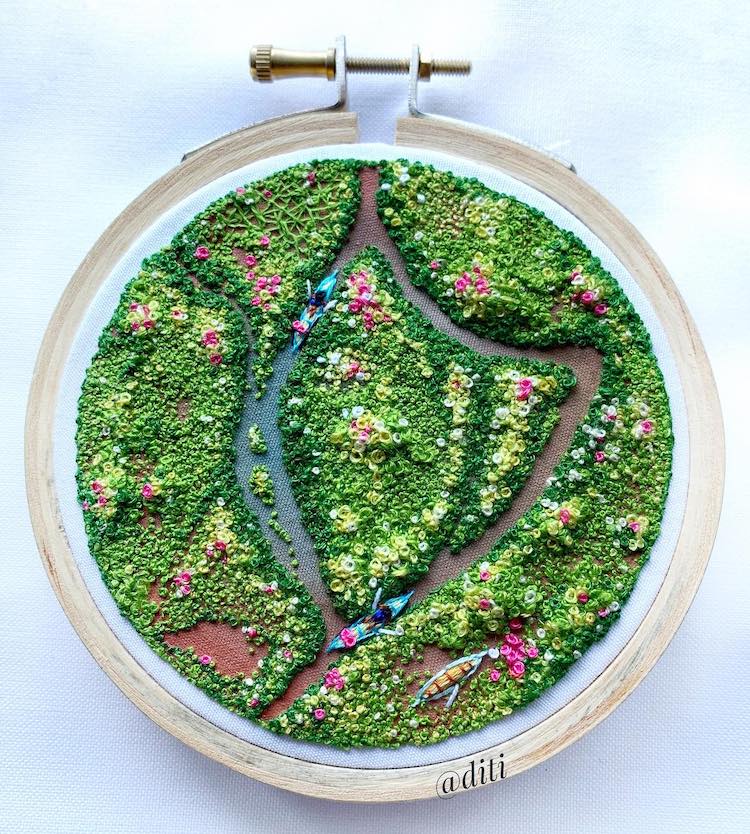 Nakış sanatçısı Diti Baruah, Kuzey Doğu Hindistan’ın kuş bakışı manzaralarını kutlayan işler yapıyor. Böylece bu bölgedeki eşsiz ve az bilinen doğal mirasın özünü ortaya koyuyor. Çalışmalarında; dokusal dikişler (Fransız düğümleri gibi), iğneli keçeleme ve hatta fırçayla boyama (geniş alanlarda) gibi farklı teknikleri birleştiriyor. Yumuşacık keçe bulutların ardında görünen ormanlar, tarlalar, göller, nehirler ve sandallar adeta insana huzur veriyor.