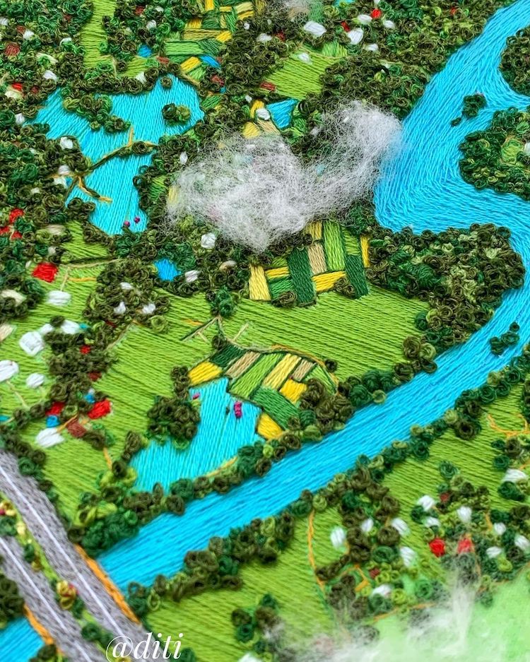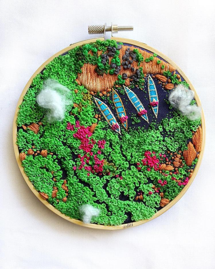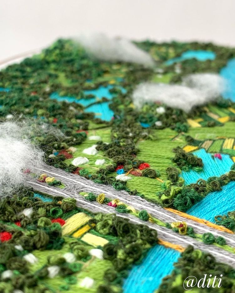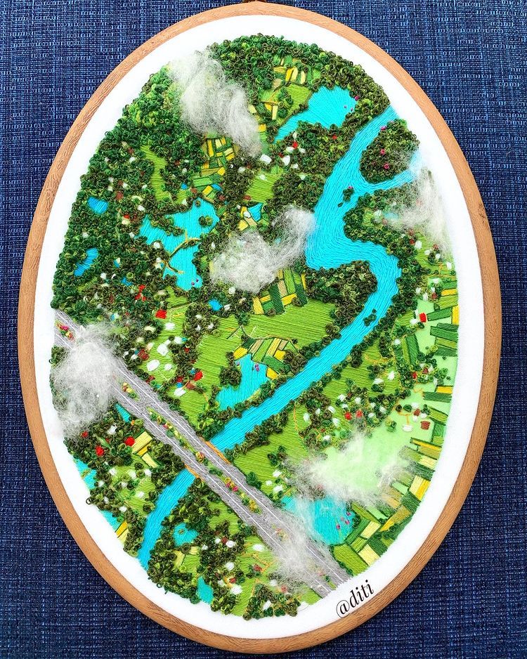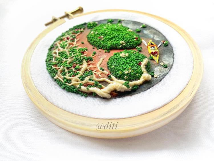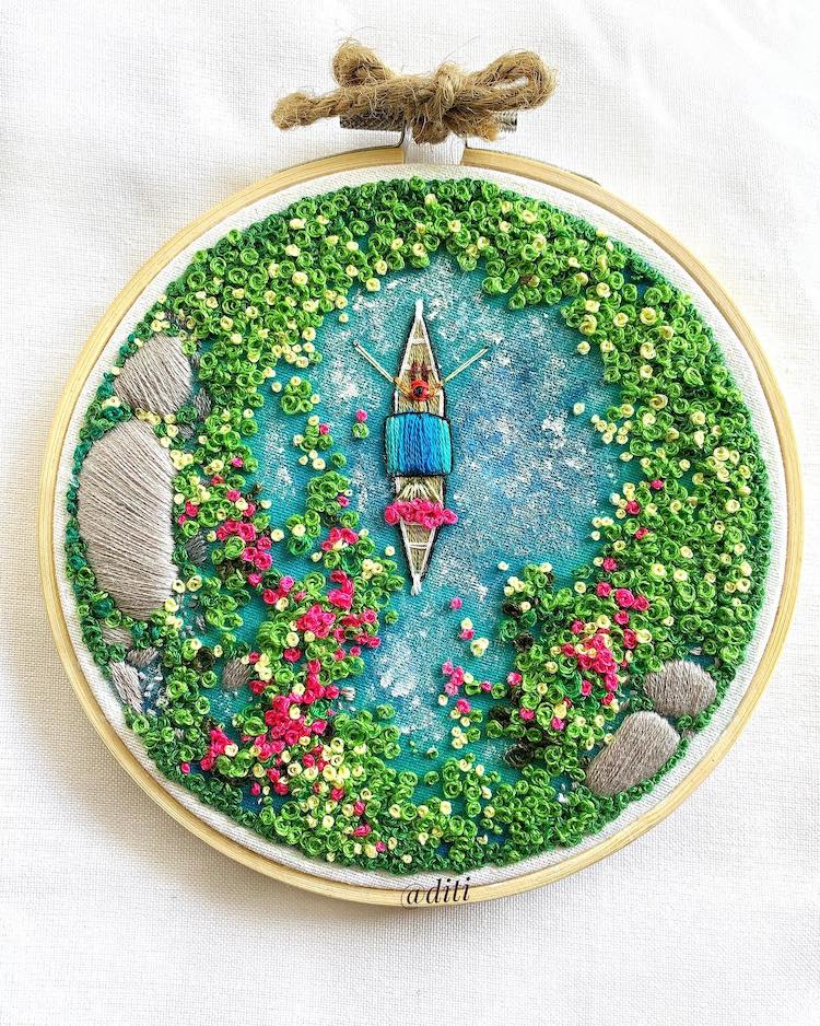 Nakış sanatçısı Diti Baruah, Kuzey Doğu Hindistan’ın kuş bakışı manzaralarını kutlayan işler yapıyor. Böylece bu bölgedeki eşsiz ve az bilinen doğal mirasın özünü ortaya koyuyor. Çalışmalarında; dokusal dikişler (Fransız düğümleri gibi), iğneli keçeleme ve hatta fırçayla boyama (geniş alanlarda) gibi farklı teknikleri birleştiriyor. Yumuşacık keçe bulutların ardında görünen ormanlar, tarlalar, göller, nehirler ve sandallar adeta insana huzur veriyor.