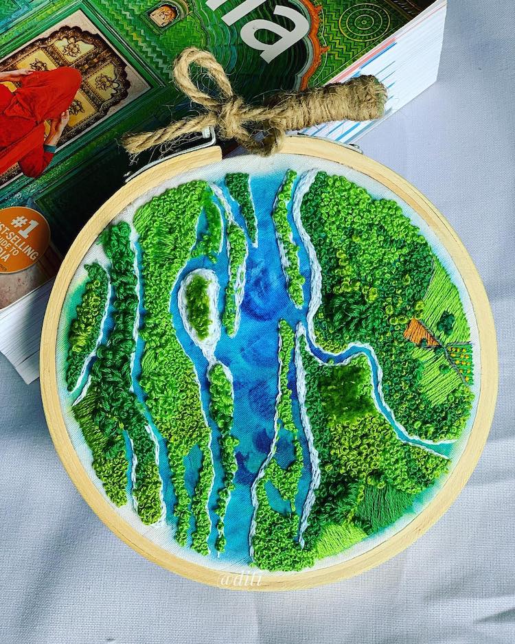 Her çağdaş nakış sanatçısı, bize bu alandaki yaratıcılığın sınır tanımadığını bir kez daha gösteriyor. Hem biçimsel yaklaşımı hem de nakışla daha önce ele alınmamış konular seçmesi, sanatçının öne çıkması açısından önemli etkenler. Örneğin; dinozor fosili nakışları, uzaylı nakışları, tipografi nakışları, el işi CMYK kataloğu, soyut nakışlar ve 3 boyutlu mutfak nakışları gibi ayırt edici çalışmalar onları yapan sanatçıların imzası haline gelmiş durumda. Şimdi yine hem biçim hem de konu seçimi açısından ayırt edici bir yaklaşım var karşımızda. Diti Baruah, havadan çekilmiş fotoğraflar misali kuş bakışı manzaralar nakışlıyor.