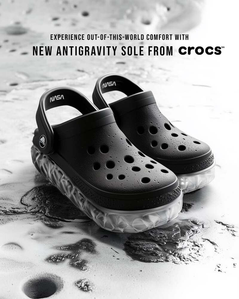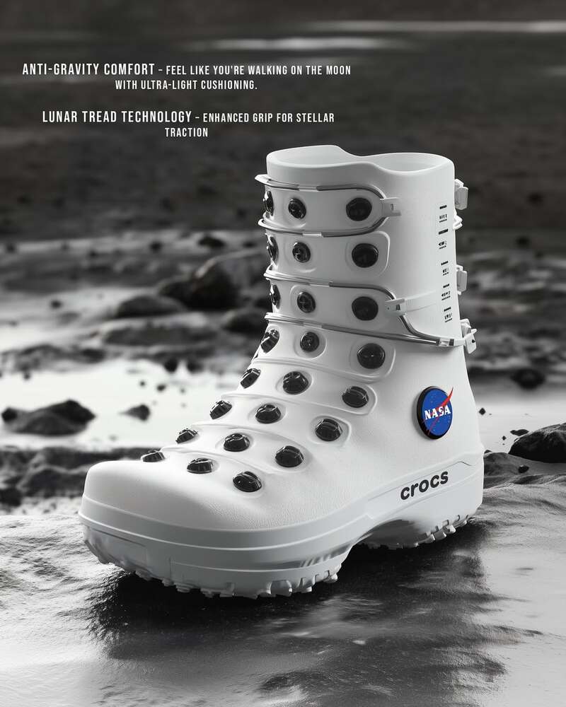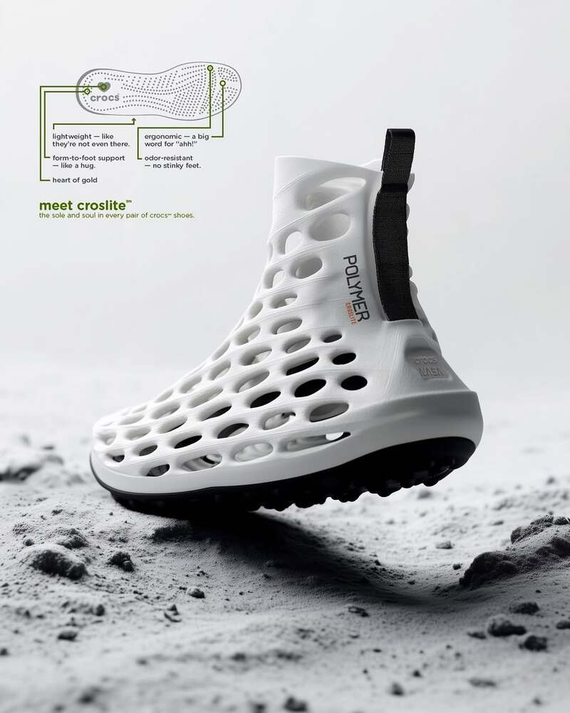Tasarımcı, modellerin bir kısmında klasik Crocs deliklerini yapay zekaya krater olarak yeniden yorumlatmış. Bu haliyle terliklerin üst yüzeyleri ayın yüzeyine benzemiş. Yüzeye çarpan meteorların neden olduğu kraterlerle dolu, kusurlu, kayalık, kumlu yüzeyi çok iyi yansıtmış.