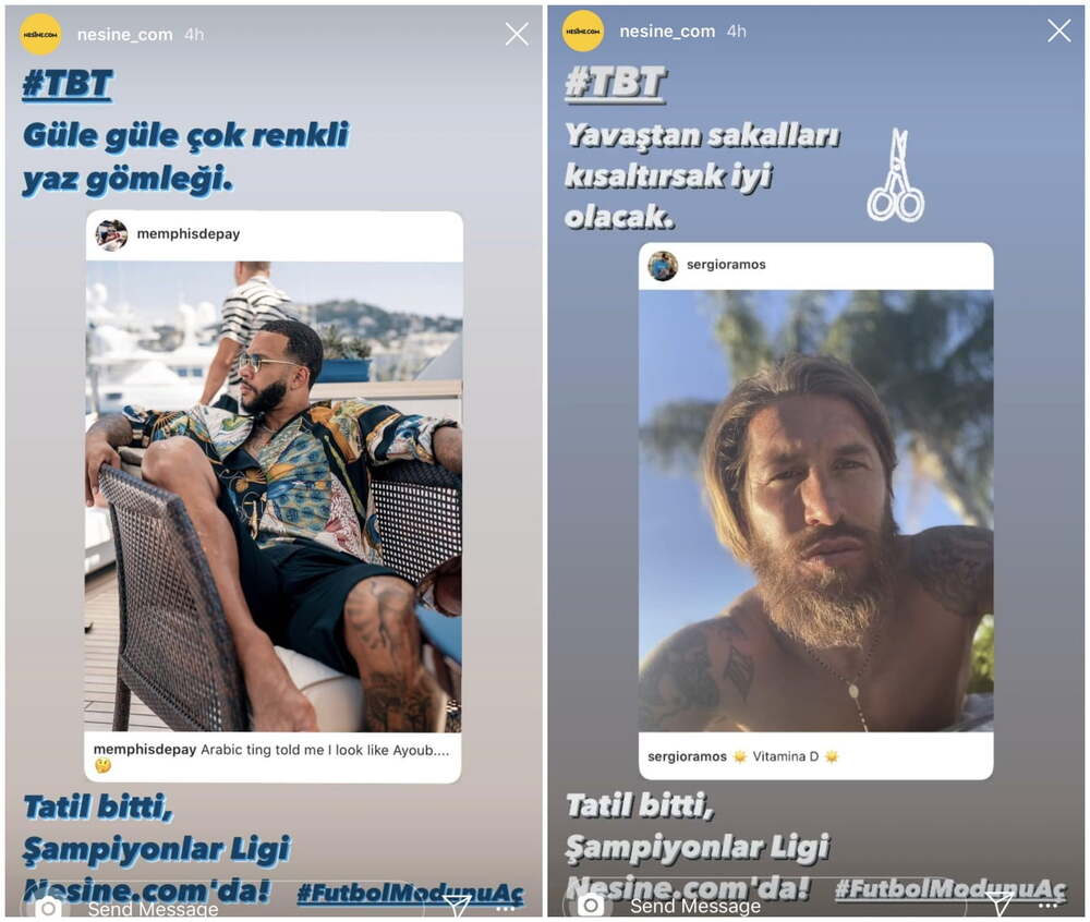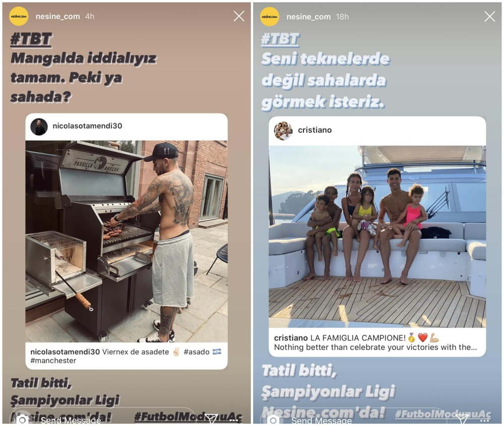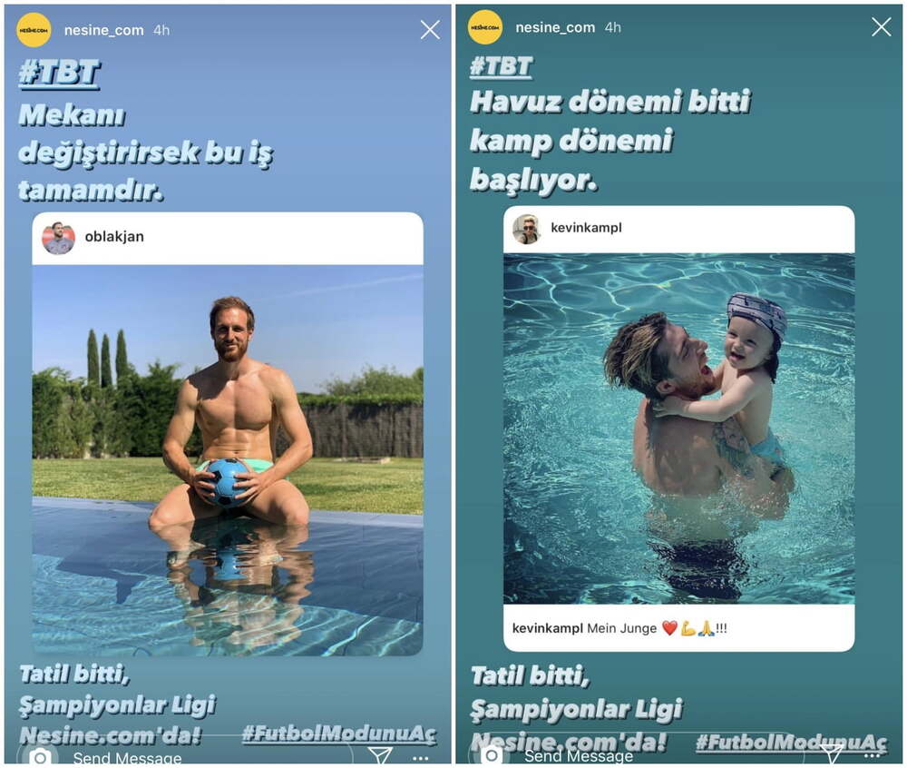 Nesine.com son 16 turu rövanş maçları gerçekleşmeden önce UEFA Şampiyonlar Ligi’nin 10 farklı takımından 10 futbolcunun kısa süre önce yüklemiş olduğu tatil fotoğraflarını Instagram Hikayeler üzerinden paylaştı. Tatilin bittiğini vurgulayarak maçların yeniden başlayacağını hatırlattı.