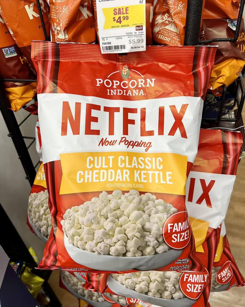 Eagle Foods grubuna bağlı Popcorn Indiana isimli patlamış mısır ve atıştırmalık üreticinin tedarikçisi olduğu bu yeni seri ‘Netflix Now Popping’ ismini taşıyor. Ve ürün paketlerinin üzerinde Netflix logosu son derece görünür bir formda kullanılıyor. Cult Classic Cheddar Kettle ve Swoonworthy Cinnamon Kettle isimli bir tuzlu bir de tatlı seçeneği bulunan bu ürünler, 4,5 dolarlık paket fiyatı ile Amerika’nın en yaygın süpermarketlerinden olan Wallmart şubelerinde ve online marketinde satışa sunuluyor.