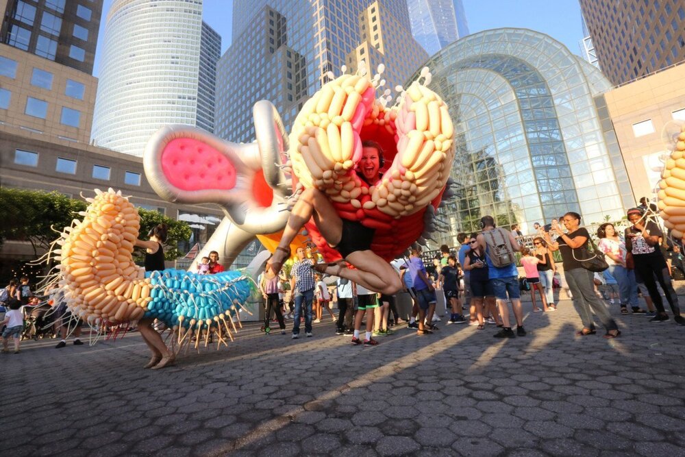 Jason Hackenwerth, organik ve biyolojik formlara sahip lateks balonlarıyla tanınıyor. Tabii hepsi dev boyutlarda. Hackenwerth’in yeni sergisi Animal Soul New York’ta adeta bir festival havası yaratmış. Çünkü bu eserlerin giyilebilir olmaları gibi önemli bir özelliği var. Dolayısıyla heykellerin sergilenme süreci onları giyen insanların sokakta gezinip halkın arasına karışmasıyla gerçekleşiyor. Böylece bölge halkı eserlerle etkileşim kurabiliyor. Megamite kostümü adını taşıyan bu giyilebilir heykelleri taşıyanlar ise bu iş için özel olarak seçilmiş profesyonel dansçılar. Heykellerin hepsi oldukça yaratıcı. Sanki 3B illüstrasyon karakterlerin balonla dev çıktısı alınmış gibi. Bu da sanatçının balon gibi bir malzemeyi kullanmaktaki ustalığını gözler önüne seriyor.