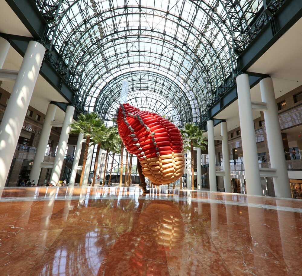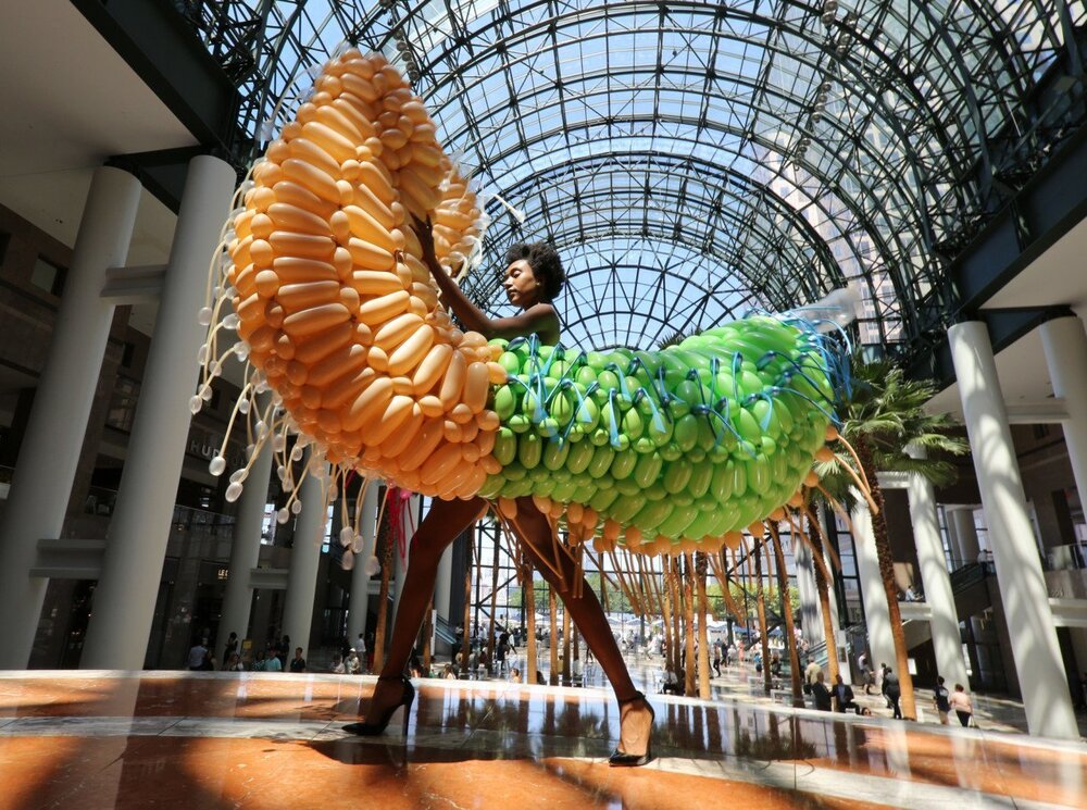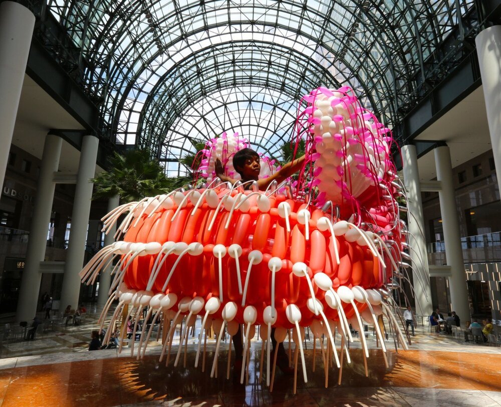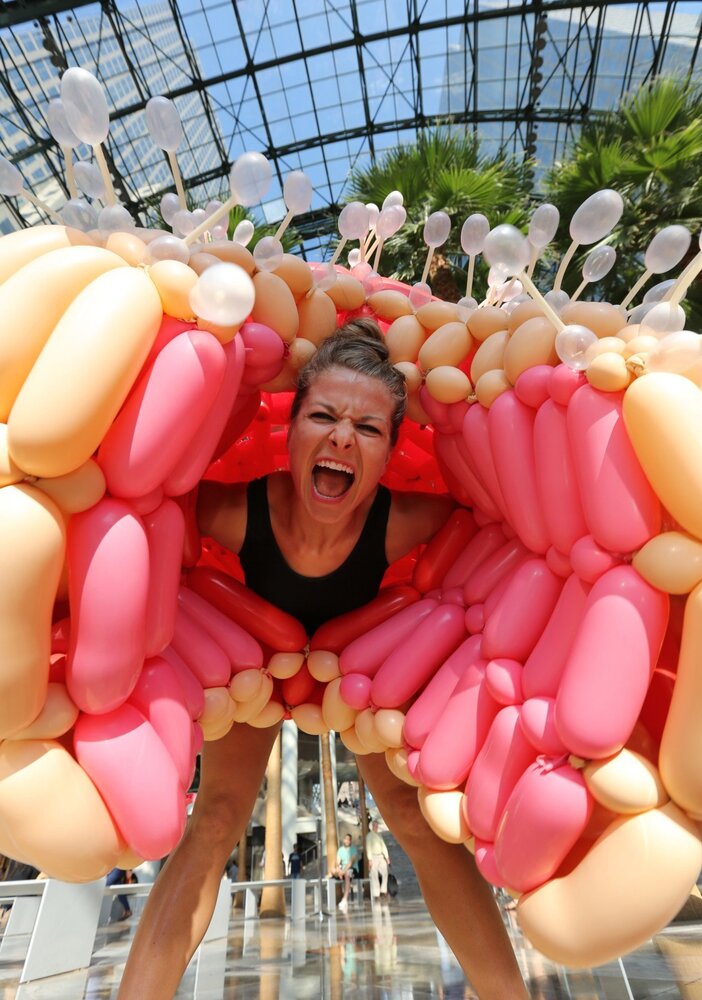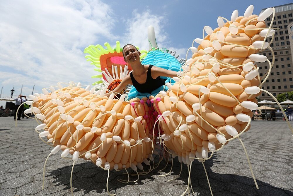 Jason Hackenwerth, organik ve biyolojik formlara sahip lateks balonlarıyla tanınıyor. Tabii hepsi dev boyutlarda. Hackenwerth’in yeni sergisi Animal Soul New York’ta adeta bir festival havası yaratmış. Çünkü bu eserlerin giyilebilir olmaları gibi önemli bir özelliği var. Dolayısıyla heykellerin sergilenme süreci onları giyen insanların sokakta gezinip halkın arasına karışmasıyla gerçekleşiyor. Böylece bölge halkı eserlerle etkileşim kurabiliyor. Megamite kostümü adını taşıyan bu giyilebilir heykelleri taşıyanlar ise bu iş için özel olarak seçilmiş profesyonel dansçılar. Heykellerin hepsi oldukça yaratıcı. Sanki 3B illüstrasyon karakterlerin balonla dev çıktısı alınmış gibi. Bu da sanatçının balon gibi bir malzemeyi kullanmaktaki ustalığını gözler önüne seriyor.