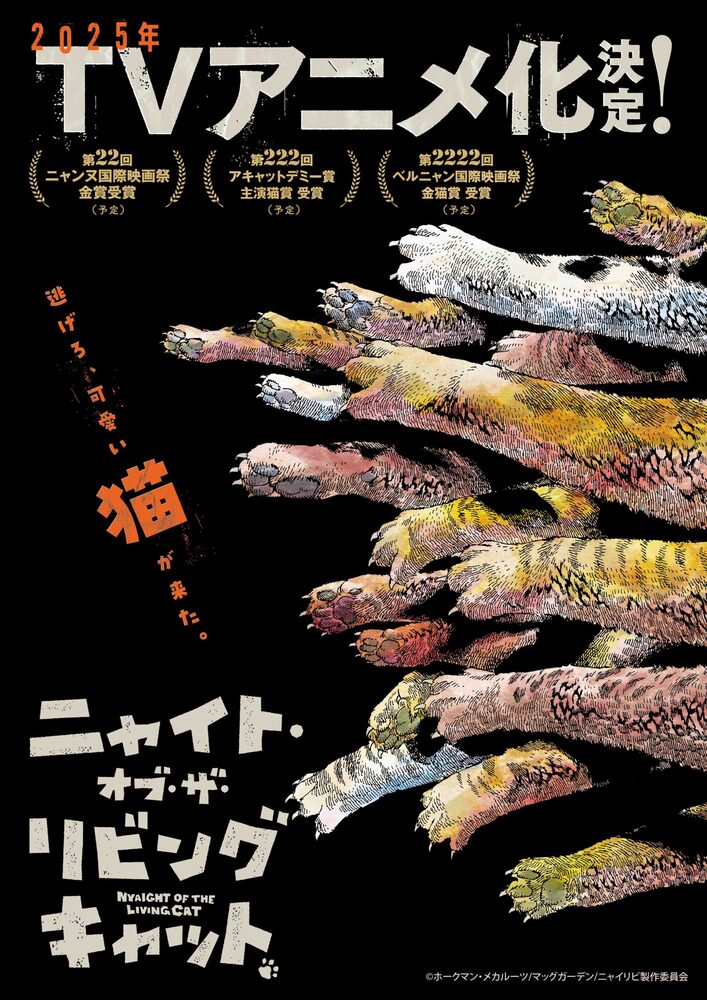 Japonya’da popüler olan bu manganın yaratıcıları Hawkman (yazar) ve Mecha-Roots (çizer). Tanıtım filmiyle birlikte paylaşılan aşağıdaki patili görsel, Mecha Roots’un ilk ciltte yer alan illüstrasyonunun renkli versiyonu. Karanlıktan çıkan birden fazla kedi patilerini uzatıyor. Resimde ayrıca Japonca “Kaç, işte sevimli kedi geliyor” anlamına gelen bir slogan da yer alıyor.