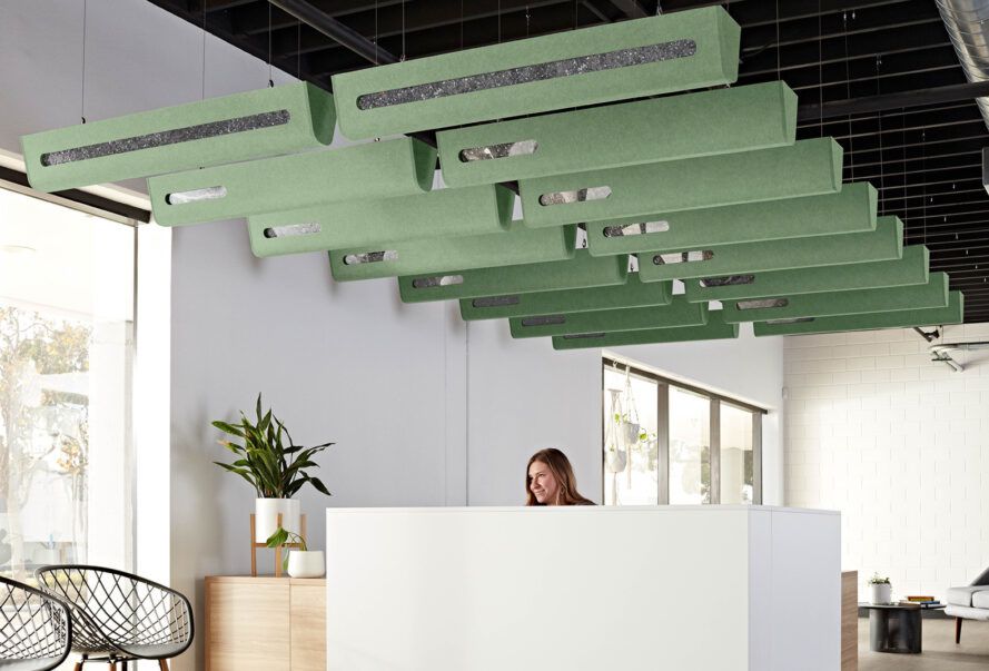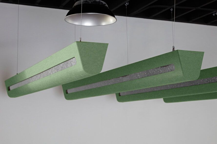 Sürdürülebilir iç mekan tasarımında uzman bir şirket olan Kirei, geri dönüştürülmüş ayakkabı ve su şişelerinden yapılmış bir akustik tavan bölmesi olan Air Baffle‘ı piyasaya sürdü. Tasarım için Nike Air Max’ten ilham alınmış. Bölmeler, geri dönüştürülmüş PET keçenin akustik özelliklerini Nike Grind’den yapılan yumuşak dolguyla birleştiriyor. “Nike Grind nedir?” diyenler için bir parantez açalım. Nike Grind, Nike’nin; üretim artıkları, Reuse-A-Shoe programıyla tüketiciden alınıp geri dönüştürülmüş eski ayakkabılar ve satılamayan ayakkabılardan oluşturduğu bir geri dönüştürülmüş malzeme koleksiyonu.