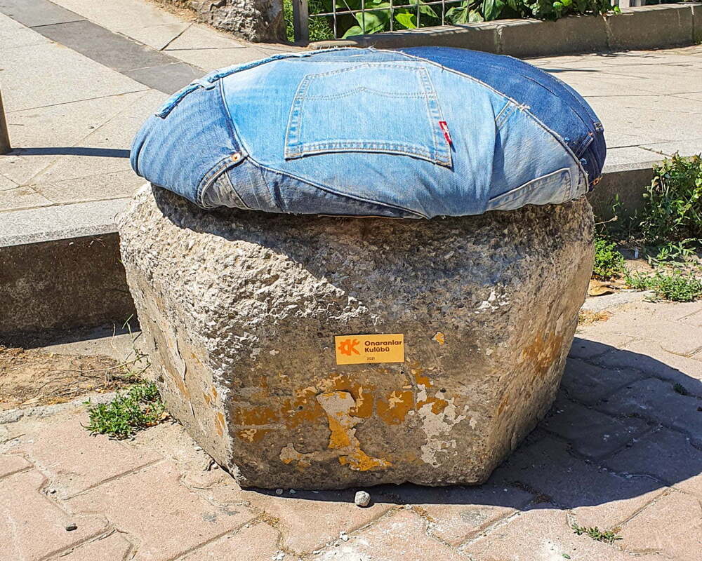 Ülkenin dört bir yanından bağışlanan ve artık kullanılmayan kot pantolonlar ileri dönüştürülerek Onaranlar Kulübü’nün sıra dışı hack’leme ögelerinin bir parçası oluyor. Dönüştürülen kot pantolonlar şehrin en dikkat çekici noktalarında yer alan, atıl durumda bulunan kent mobilyalarına yaratıcı bir tasarımlarla uygulanıyor.