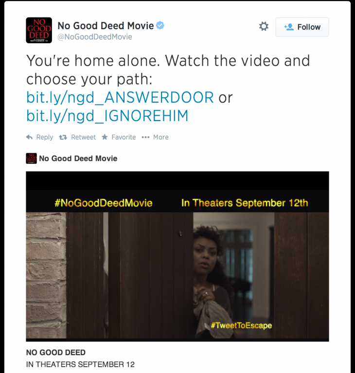 No Good Deed, ABD’de 12 Eylül’de gösterime girecek olan bir gerilim filmi. Kadrosunda Idris Elba ve Taraji P. Henson gibi sağlam oyuncular bulunduran fim, gösterim tarihi yaklaşırken Twitter üzerinden daha önce görmediğimiz bir tanıtım aktivitesini hayata geçirdi: Tweet to Escape!