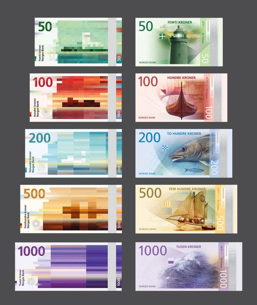 Bu yıl içerisinde tedavüle gireceği bilinen banknotlar, Norges Bank tarafından 30 Mayıs tarihiyle kullanıma sunuldu. Norveç’in banknotları artık arka yüzünde veriye dayanan piksel tasarımları ön yüzündeyse ülke kültürünün ikonik değerlerini taşıyacak. The Living Spaces serisinin özünde Viking gemisi, deniz feneri ve balık gibi Norveç kültürünün temel parçalarına yer veriyor. The Beauty of Boundaries serisi ise Beaufort rüzgar ölçeğine göre kademeli olarak bozulan görsellerden oluşuyor. 50 kronor birkaç piksel ile fondaki görüntünün anlaşılabildiği bir görüntü sunarken 1000 kronorda rüzgarın şiddetiyle birlikte görsel öylesine pikselleniyor ki adeta görüntü anlaşılmaz hale geliyor.