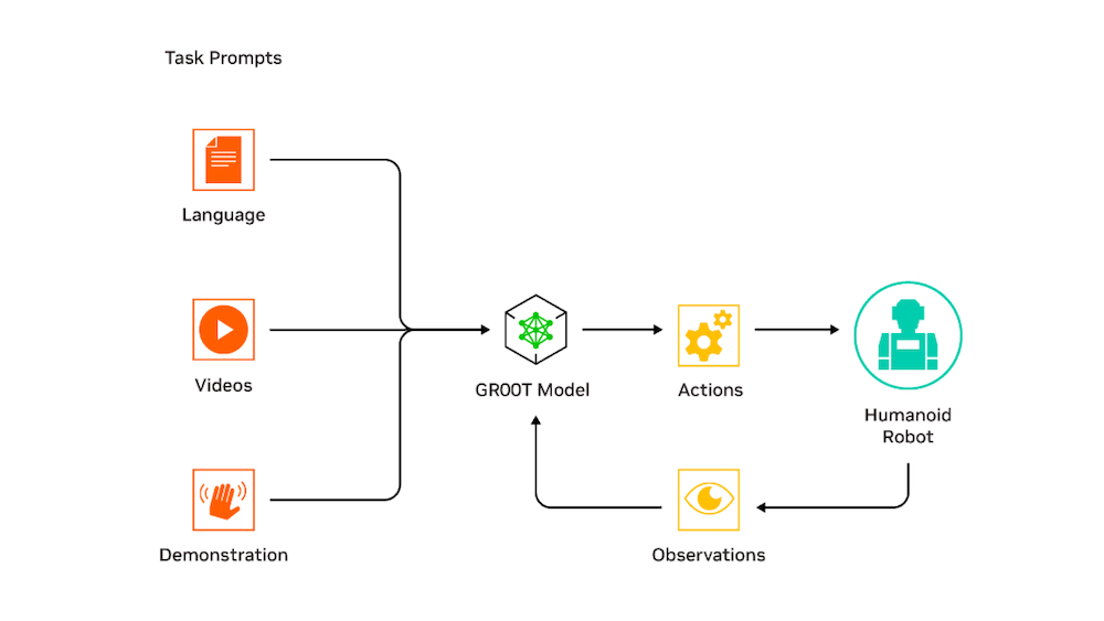 “Generalist Robot 00 Teknolojisi” anlamına gelen GR00T tarafından desteklenecek robotlar, doğal dili anlayacak ve insan eylemlerini gözlemleyerek hareketleri taklit edecek şekilde tasarlanacak. Gerçek dünyada gezinmek, uyum sağlamak ve onunla etkileşime geçmek için koordinasyonu, el becerisini ve diğer becerileri hızla öğrenecek.