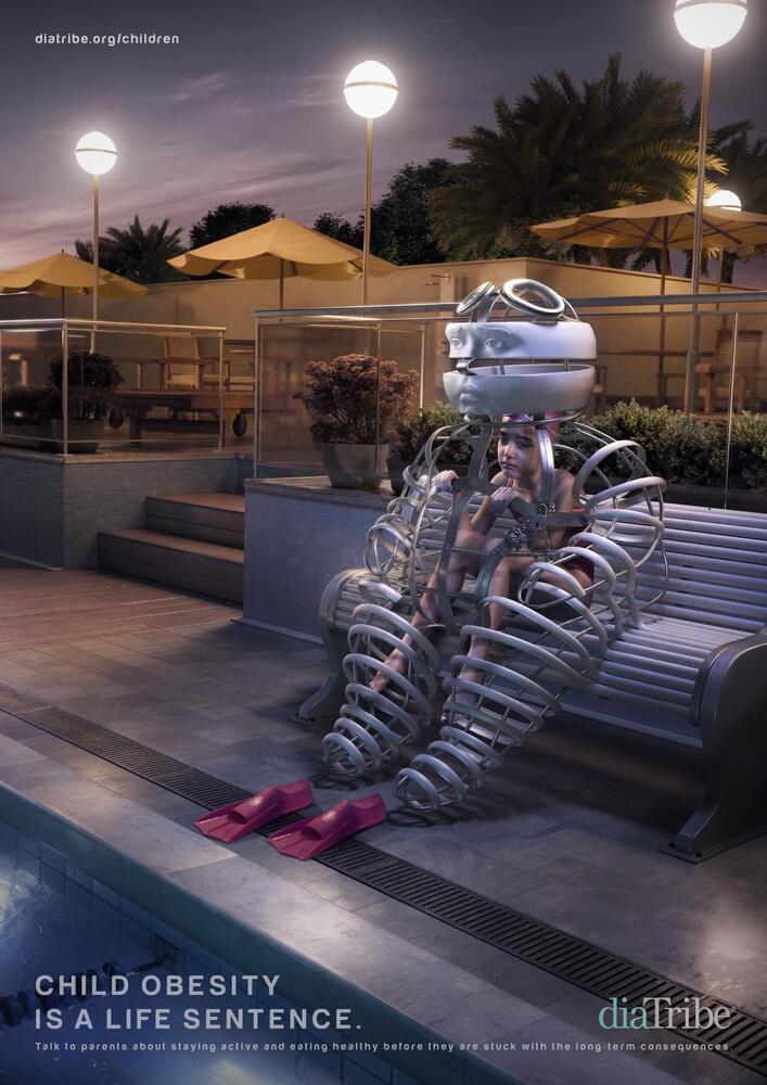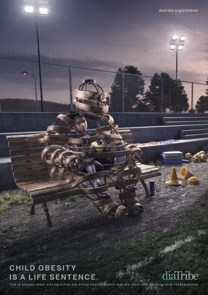 Çocukluk dönemindeki obezite, günümüz toplumlarında yaygın bir problem. Küçük yaşlarda obeziteyle tanışan çocuklar yetişkinliklerinde de maalesef kolay kolay zayıflayamıyorlar. Yani obezite, çocuklar için ömür boyu süren fiziksel ve ruhsal bir mahkumiyet halini de beraberinde getiriyor. Diyabet hastalarının bir araya geldiği platform Diatribe.org’un Area 23’yle hazırladığı basılı reklam kampanyası da bu konuya dikkat çekiyor. Reklam afişlerinde, demir parmaklıklardan yapılan şişman bedenlere hapsolmuş mutsuz çocuklar görüyoruz.