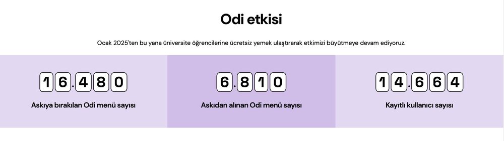 2025’in başında kurulan sosyal etki girişimi Odi (Öğrenci-dostu-işletme) askıda yemek sistemini anlaşmalı restoranlardan öğrencilerin ücretsiz yemek almasını sağlıyor. Destekçilerden gücünü alan Odi bu iyilik ve dayanışma hareketini büyütmeye davet ediyor.