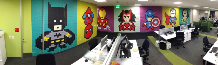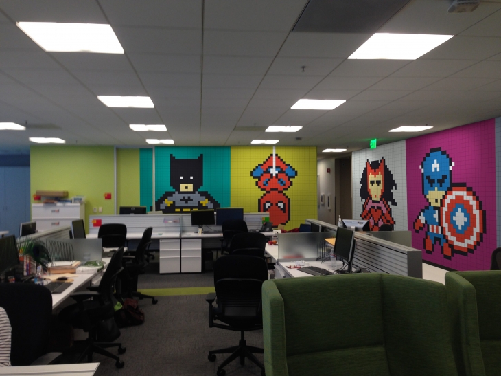 İş sırasında bir an için nefes almak isteyip kafamızı kaldırdığımızda gördüğümüz şey genellikle duvar oluyor. Boş, düz ve tek renk duvarlar. Bu duvarları renklendirerek çalışma alanını canlandırmak da sadece bizim elimizde. Boş duvarlardan sıkılan bir yaratıcı ajans çalışanı da Ben Brucker. Hatta o kadar sıkılmış olsa gerek ki, duvarlarını baştan sona Iron Man, Batman, Wonder Woman, Superman gibi kahramanlarla doldurmuş.