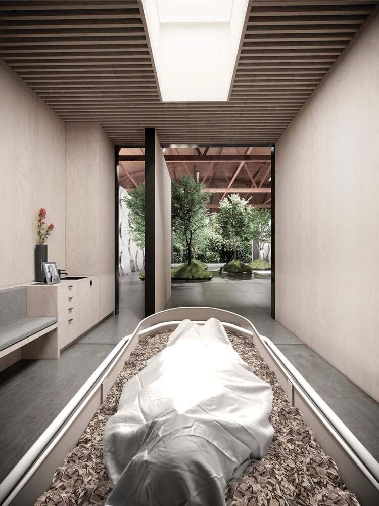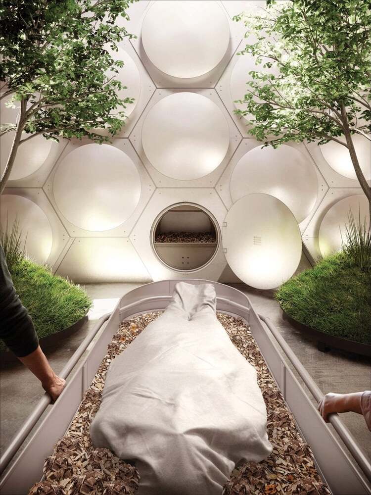 Amerikan şirketi Olson Kundig Architects, Seattle’da insan vücudunu komposte ederek organik gübreye ve toprağa dönüştürüleceği ölüm sonrası bir tesis için planlar yapıyor. Ölü yakmaya ve gömülmeye alternatif sunmak üzere kurulan şirket 1,719 metrekarelik merkezde hizmet verecek. Recomposte ismi verilen proje, 2018’de Washington’un insan kompostunu yasallaştıran ilk ABD eyaleti olmasının ardından ortaya çıktı. 2021 yılında tamamlanması planlanan tesisin tamamlanması ve ölüm sonrası büyük ölçüde doğal çürümeyi öneren ilk tesis olması bekleniyor.