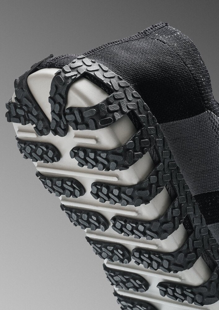 Disassembly Lab ayakkabılarını bu kadar harika yapan şey; ayakkabının onarılmasını ve geri dönüştürülmesini kolaylaştıran, sökülmesi kolay parçalara sahip yapısı. Ayakkabıların en çarpıcı olanı, yukarıda da söylediğim gibi lastikli versiyonu. Bu tasarım, ilk bakışta iki ana bölümden oluşuyor. Bunlardan biri, etrafına bir parça lastik bant sarmanıza olanak tanıyan perçinler/tapalar içeren üst gövdesi. Diğer ise dış tabanı. Lastik bant bu iki yarımı bir arada tutarak hareket sırasında esneklik sağlıyor. Sonuç olarak, burada lastik bant sadece bir tasarım özelliği olmanın ötesine geçerek, Disassembly Lab tasarımının ikonik bir öğesi haline gelmiş. Sürdürülebilirliği büyük ölçüde görsel bir motife dönüştürdüğü için de benzer demonte spor ayakkabılar arasında tasarımıyla öne çıkmayı başarmış.